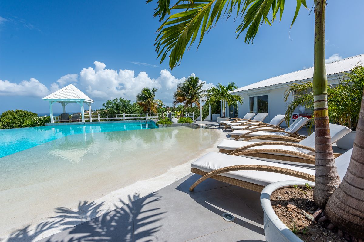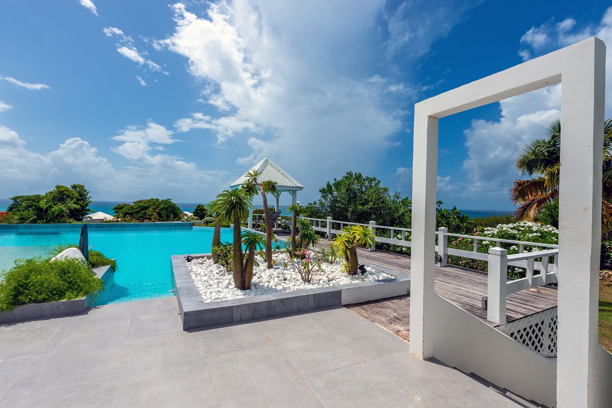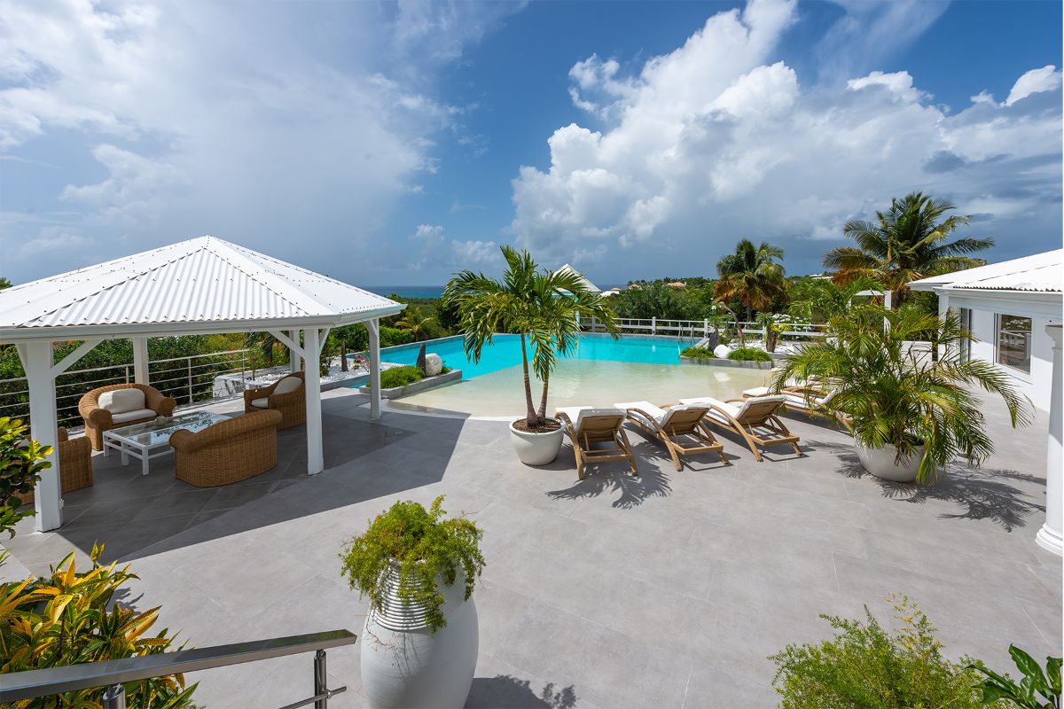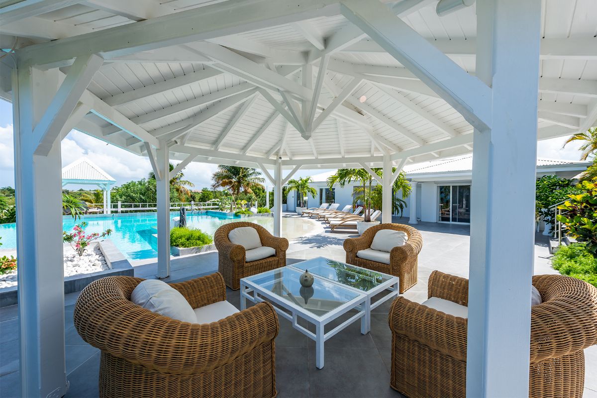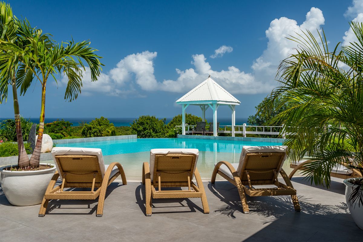 A hexagonal gazebo near the pool provides additional shaded seating, perfect for relaxing with a book or enjoying a quiet moment during the day. The villa’s outdoor terraces offer multiple areas for lounging and dining, all set against the backdrop of the Caribbean Sea.