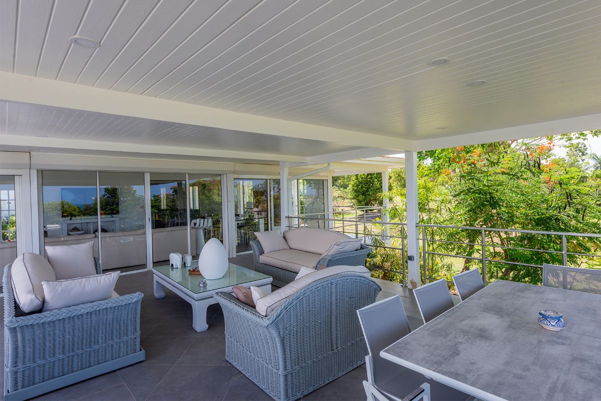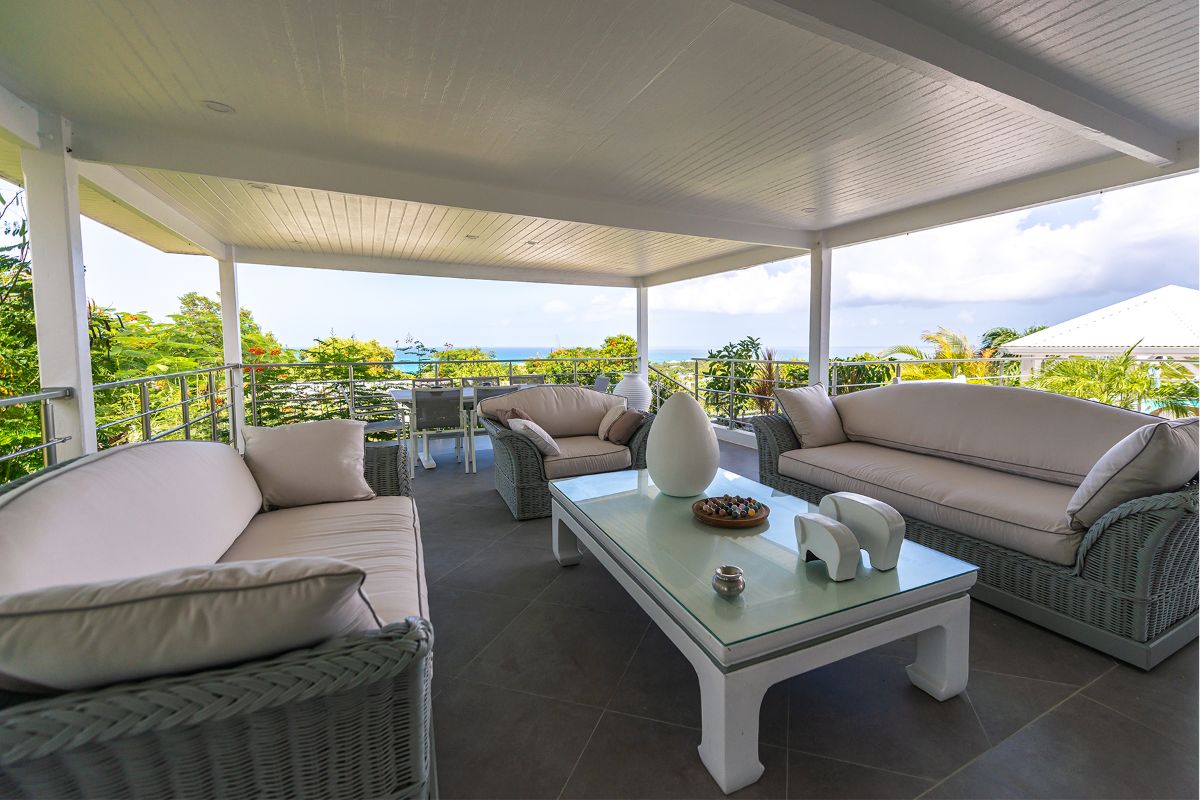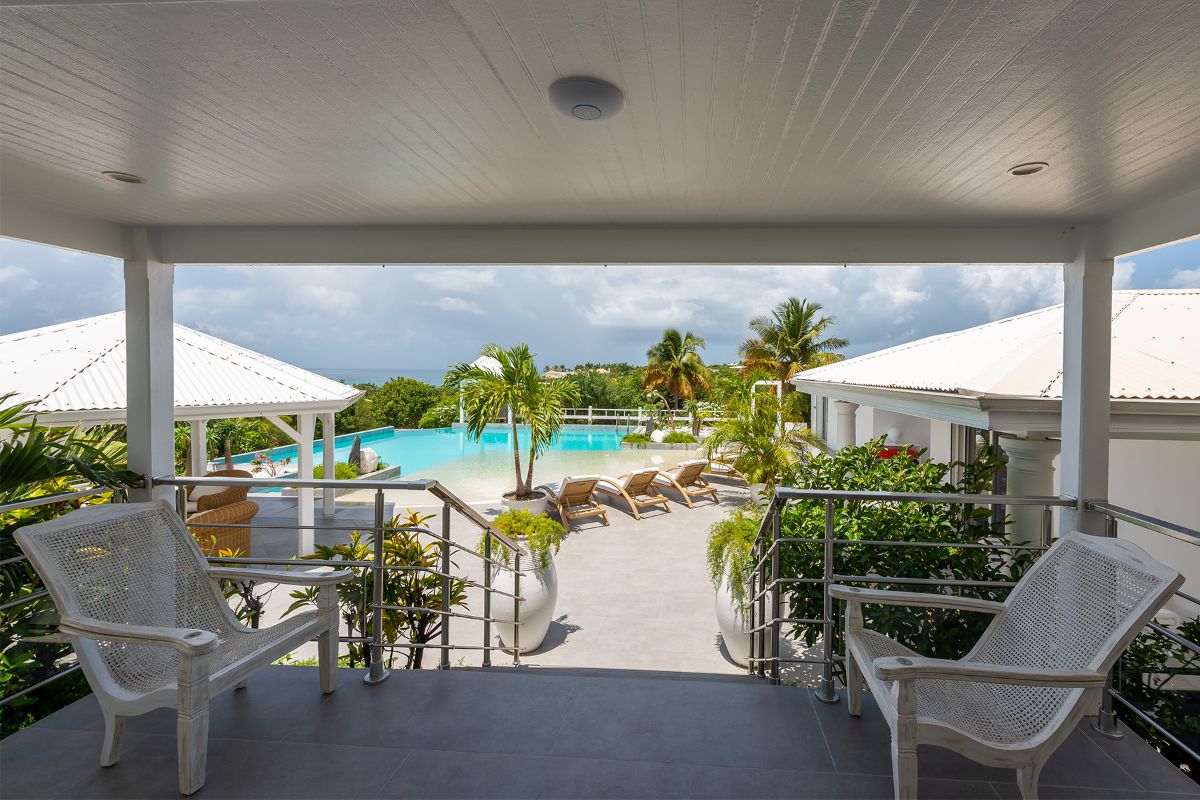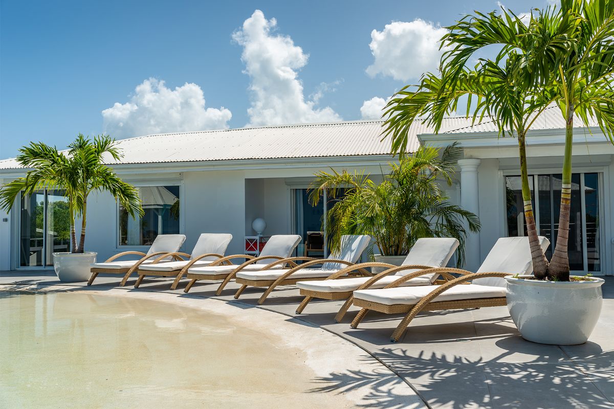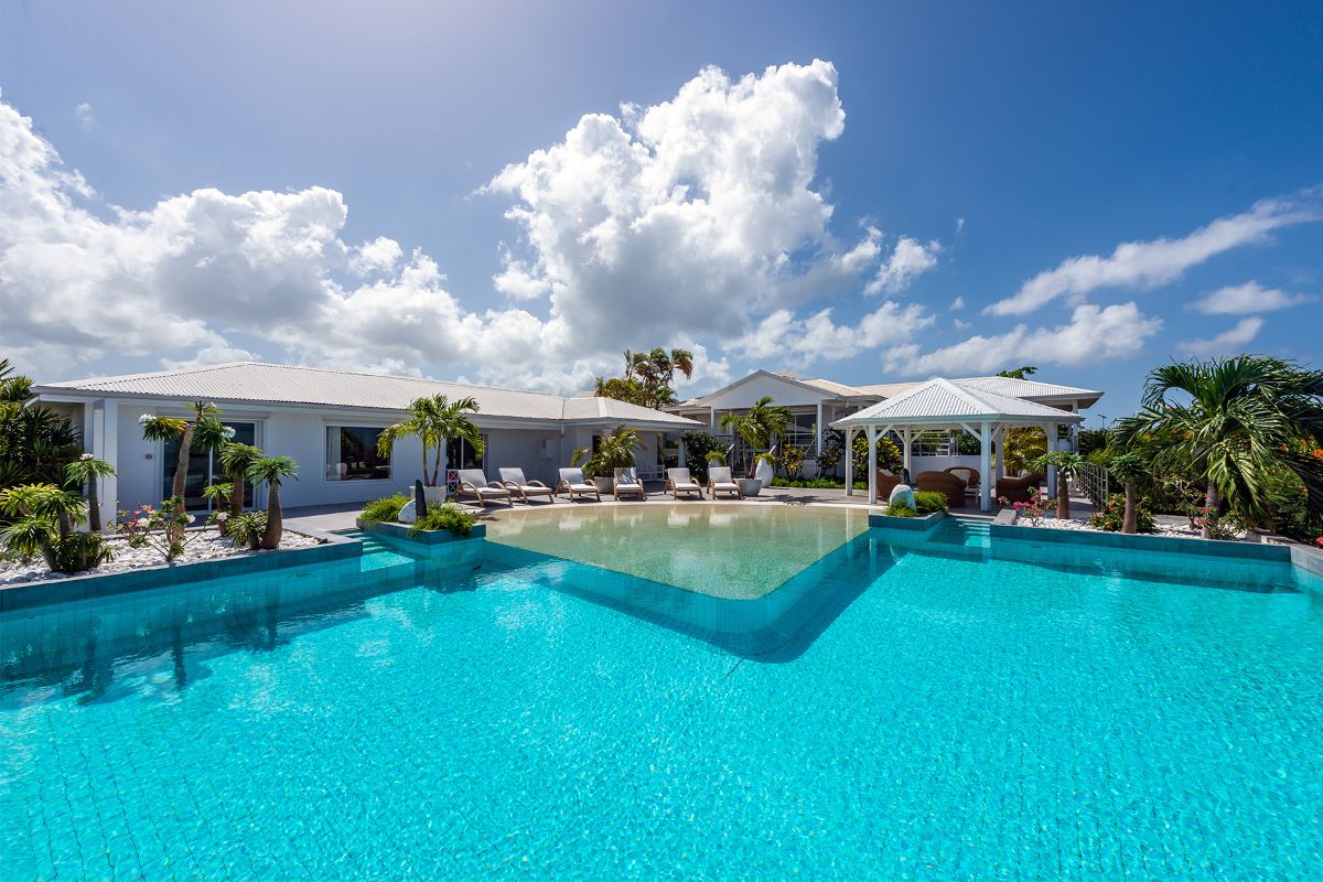 A hexagonal gazebo near the pool provides additional shaded seating, perfect for relaxing with a book or enjoying a quiet moment during the day. The villa’s outdoor terraces offer multiple areas for lounging and dining, all set against the backdrop of the Caribbean Sea.