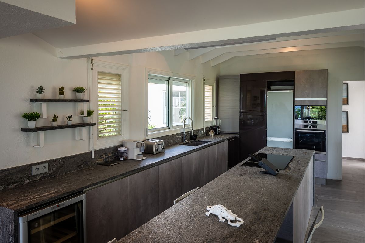 The open-plan kitchen is fully equipped with Bosch and Smeg appliances, long stone countertops, and ample workspace. Additional storage and a second refrigerator are located to the rear of the kitchen. Glass sliding doors lead to a small, intimate outdoor terrace that is ideal for breakfast or brunch in the fresh air. Covered terraces extending from the living room offer further space for outdoor dining, lounging, and enjoying the Caribbean sunsets.
