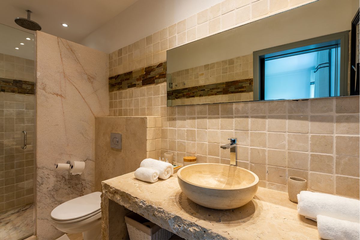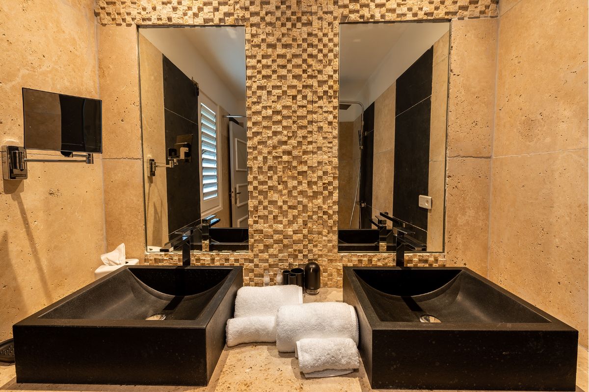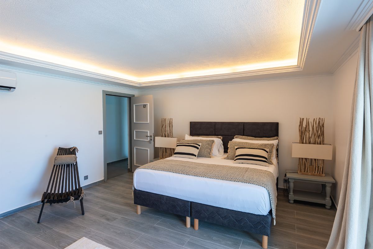 The villa features five stylish bedrooms, each decorated in a calm, contemporary palette using natural fabrics and clean, monochromatic tones. All bedrooms include en-suite bathrooms finished in beige and black natural stone, creating a modern yet timeless feel. Large smart TVs are fitted in every bedroom, and the primary bedroom also includes a spacious walk-in closet.