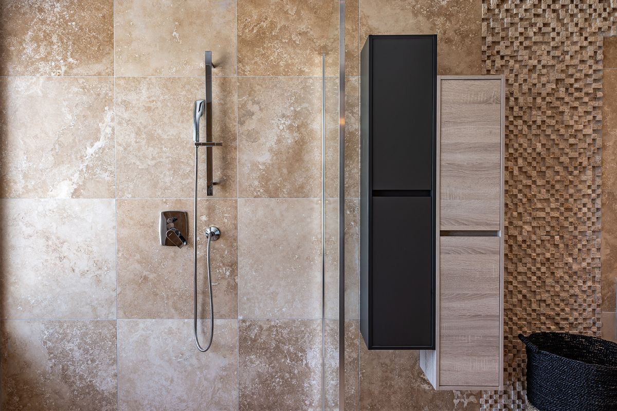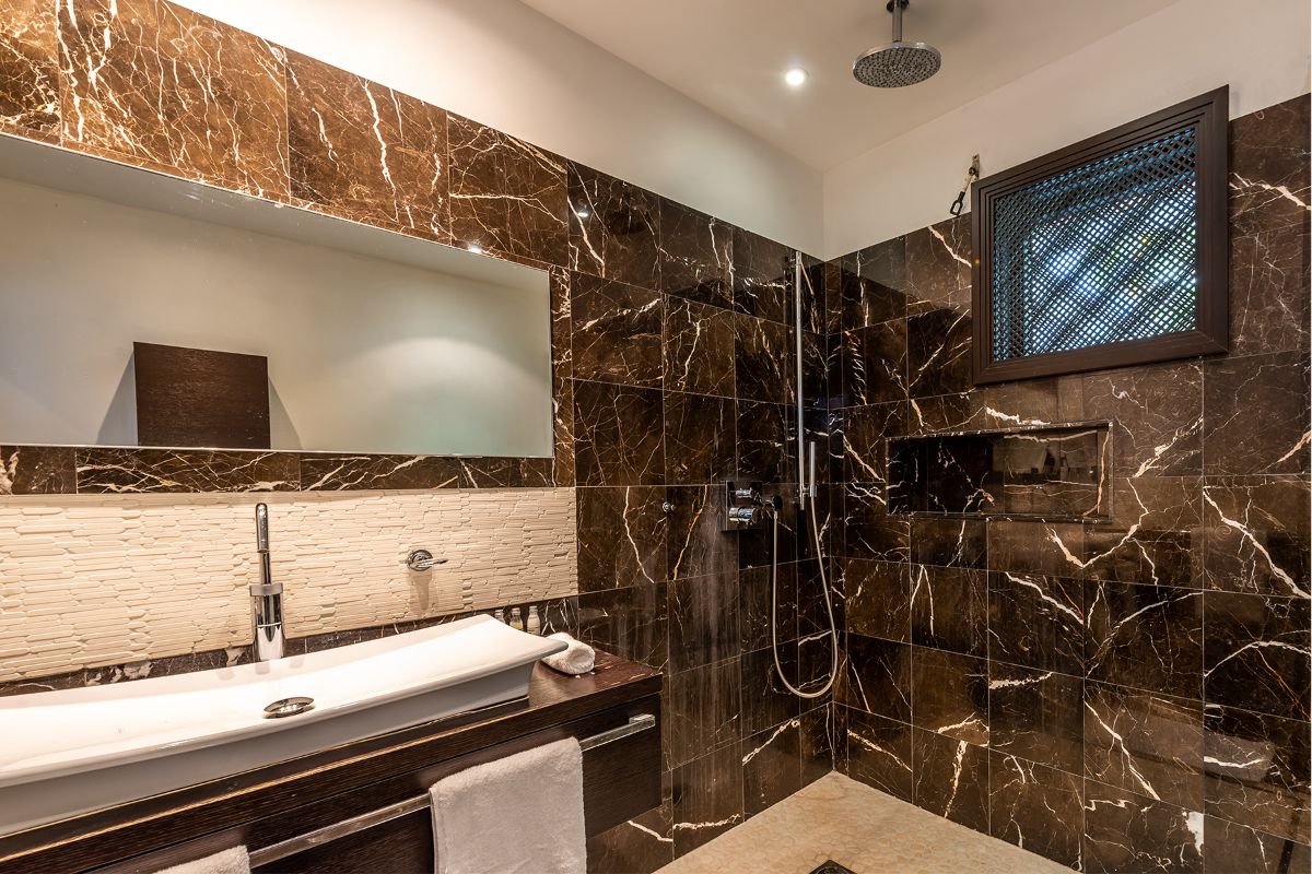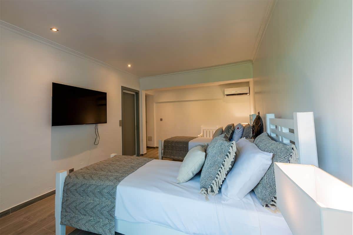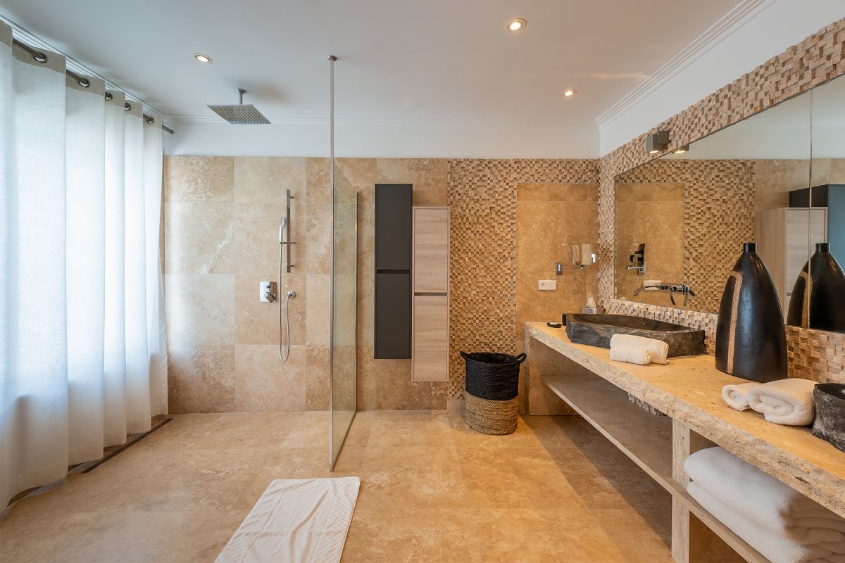 The villa features five stylish bedrooms, each decorated in a calm, contemporary palette using natural fabrics and clean, monochromatic tones. All bedrooms include en-suite bathrooms finished in beige and black natural stone, creating a modern yet timeless feel. Large smart TVs are fitted in every bedroom, and the primary bedroom also includes a spacious walk-in closet.