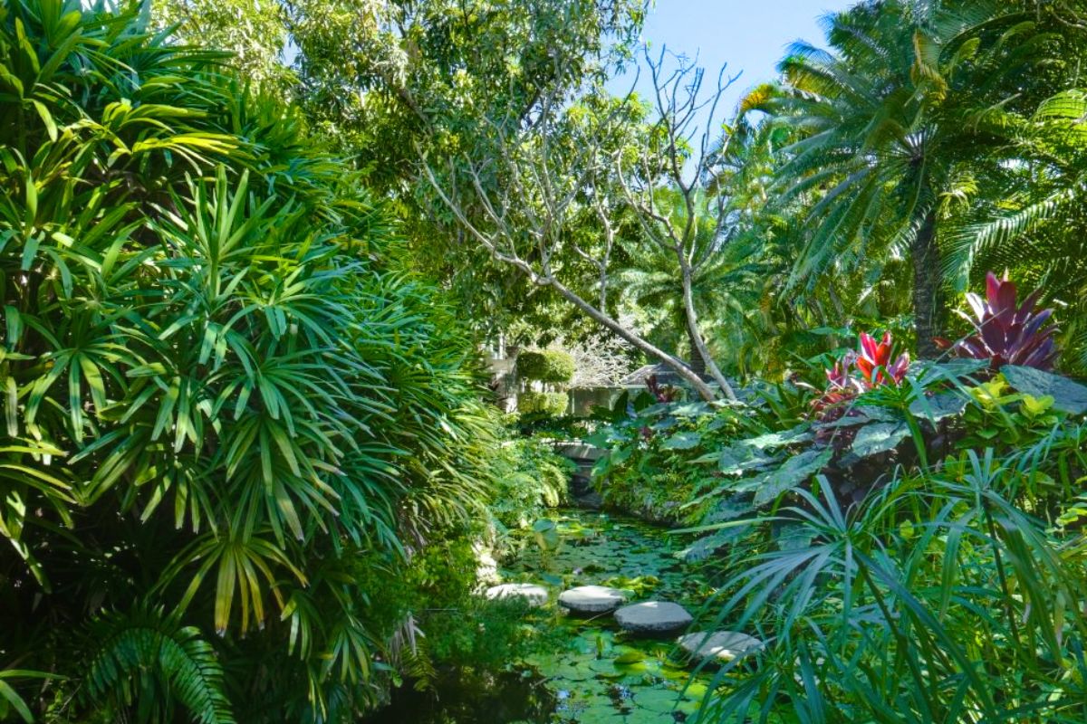 The outdoor spaces at Mango Bay are as enchanting as the interiors. Garden paths wind through lush landscaping to a charming seaside dining gazebo, perfectly positioned for meals with ocean views. A picturesque lily pond adds to the tranquil atmosphere of the grounds.