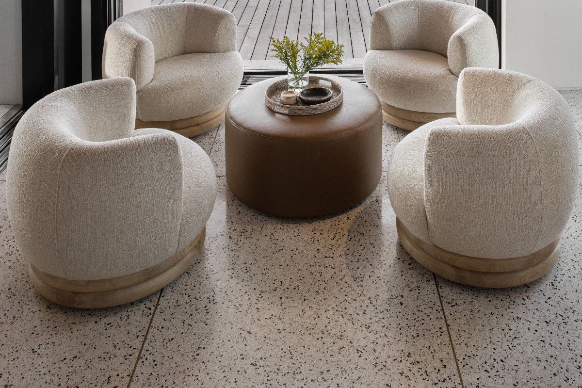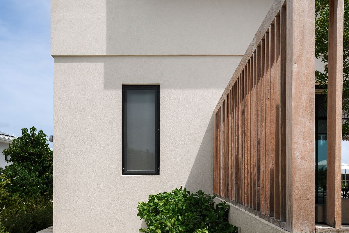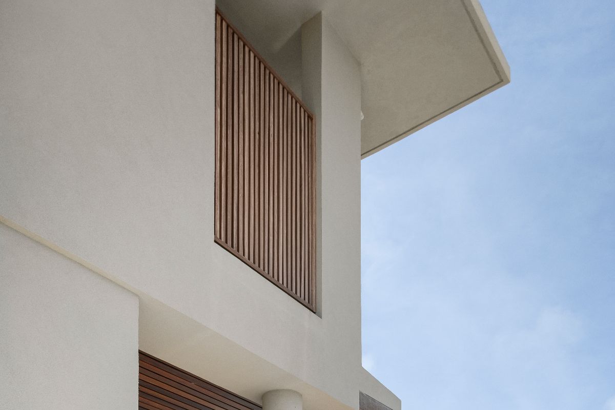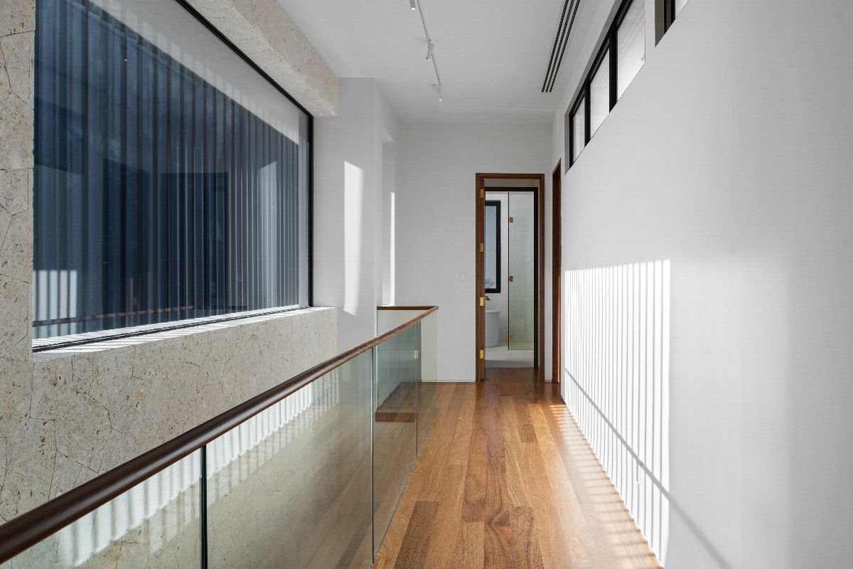 The interiors balance modern design with warmth and comfort. Timber-clad ceilings and terrazzo floors soften the clean architectural lines, while fully pocketing glass doors allow natural light to flood the living spaces.