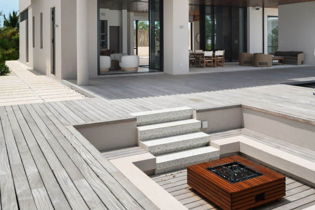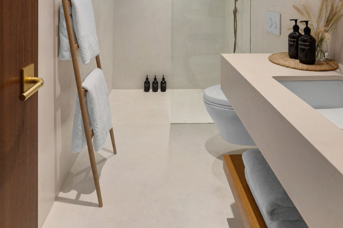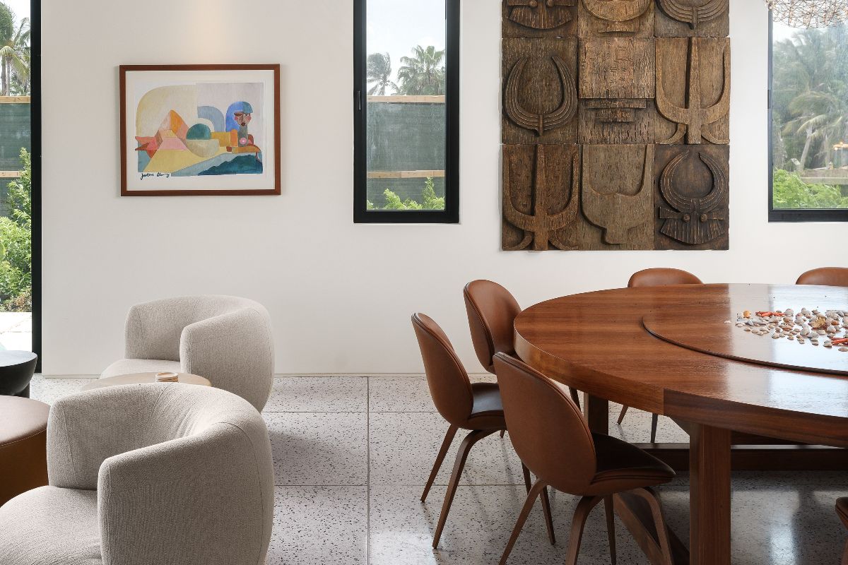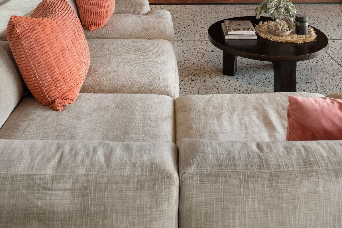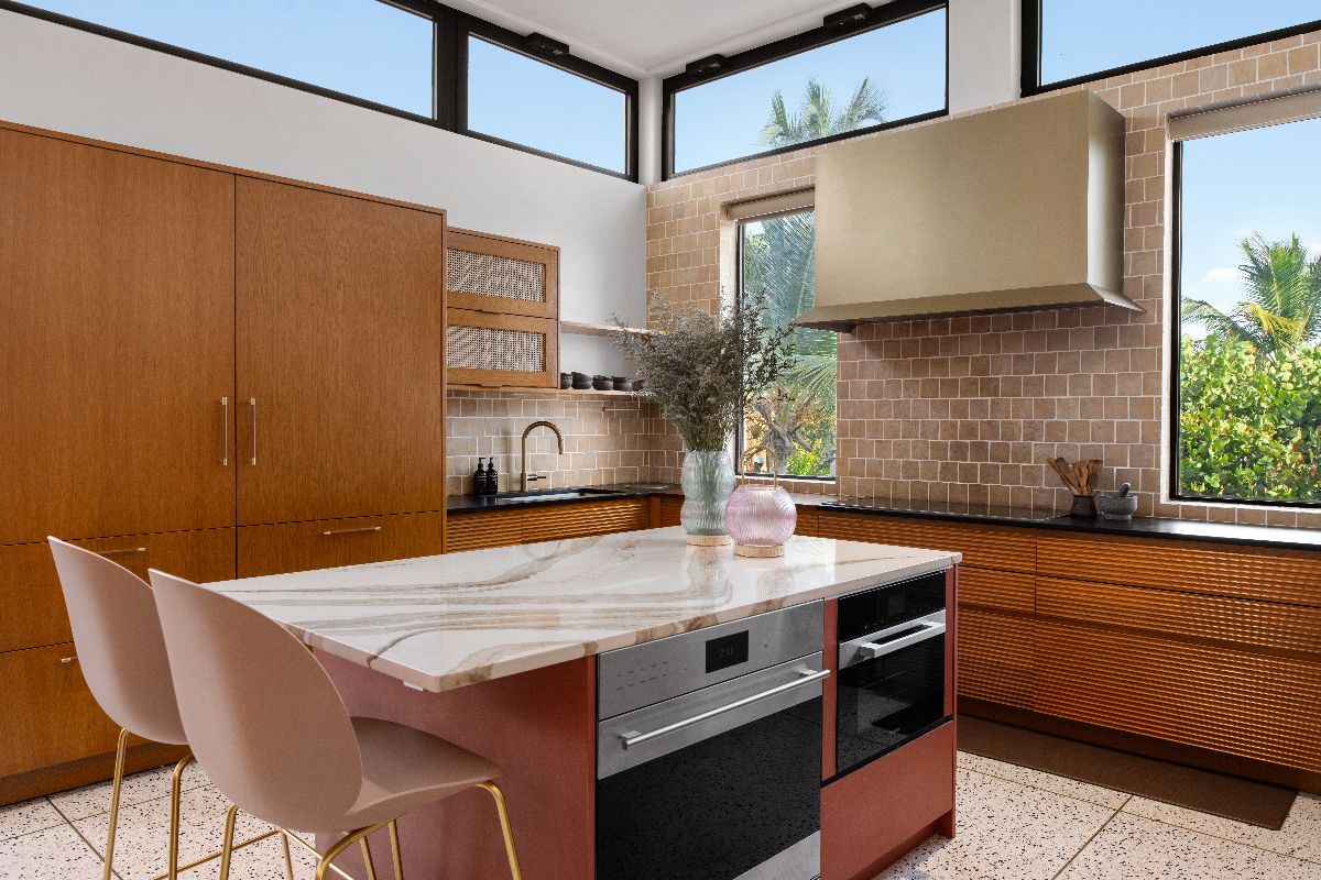 The interiors balance modern design with warmth and comfort. Timber-clad ceilings and terrazzo floors soften the clean architectural lines, while fully pocketing glass doors allow natural light to flood the living spaces.