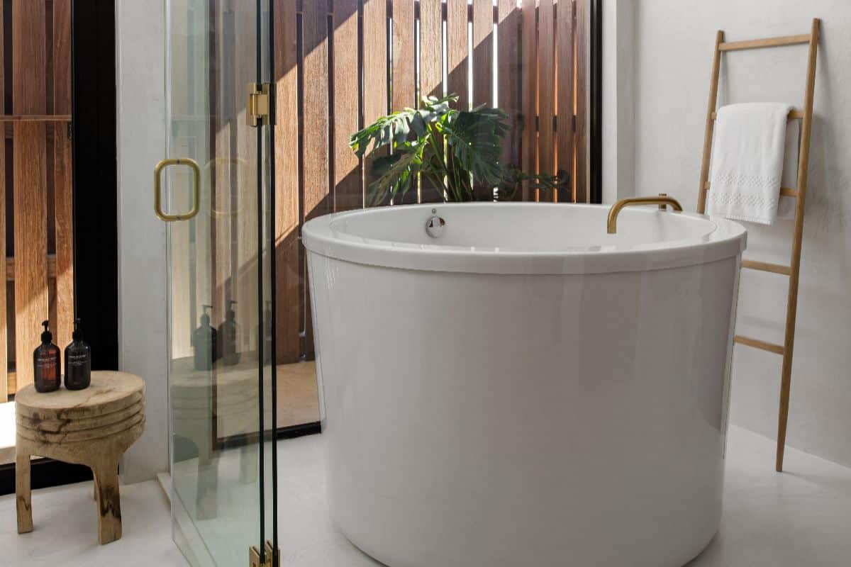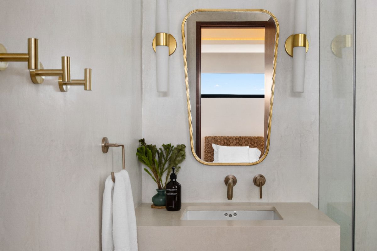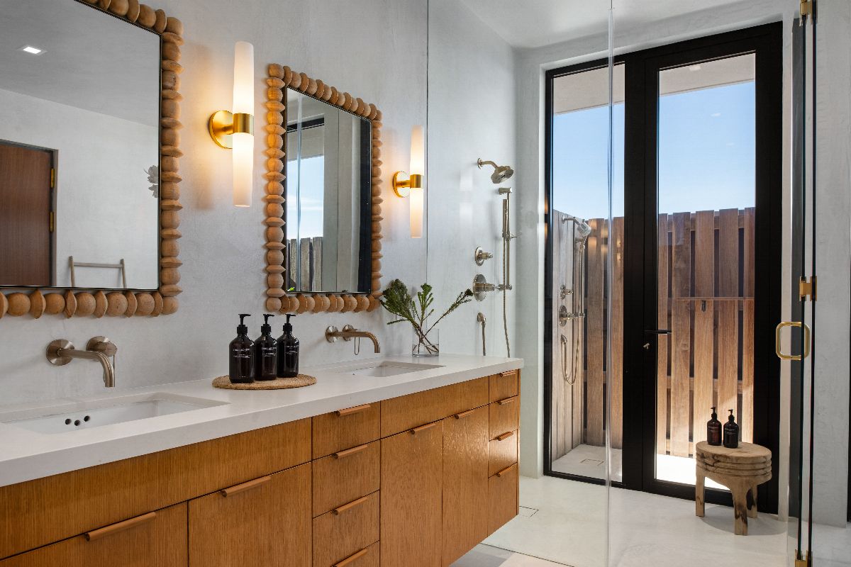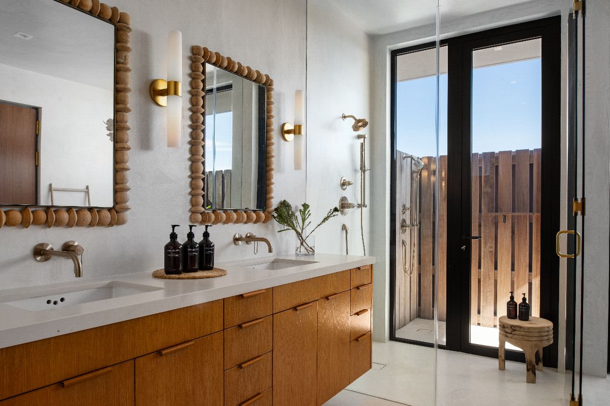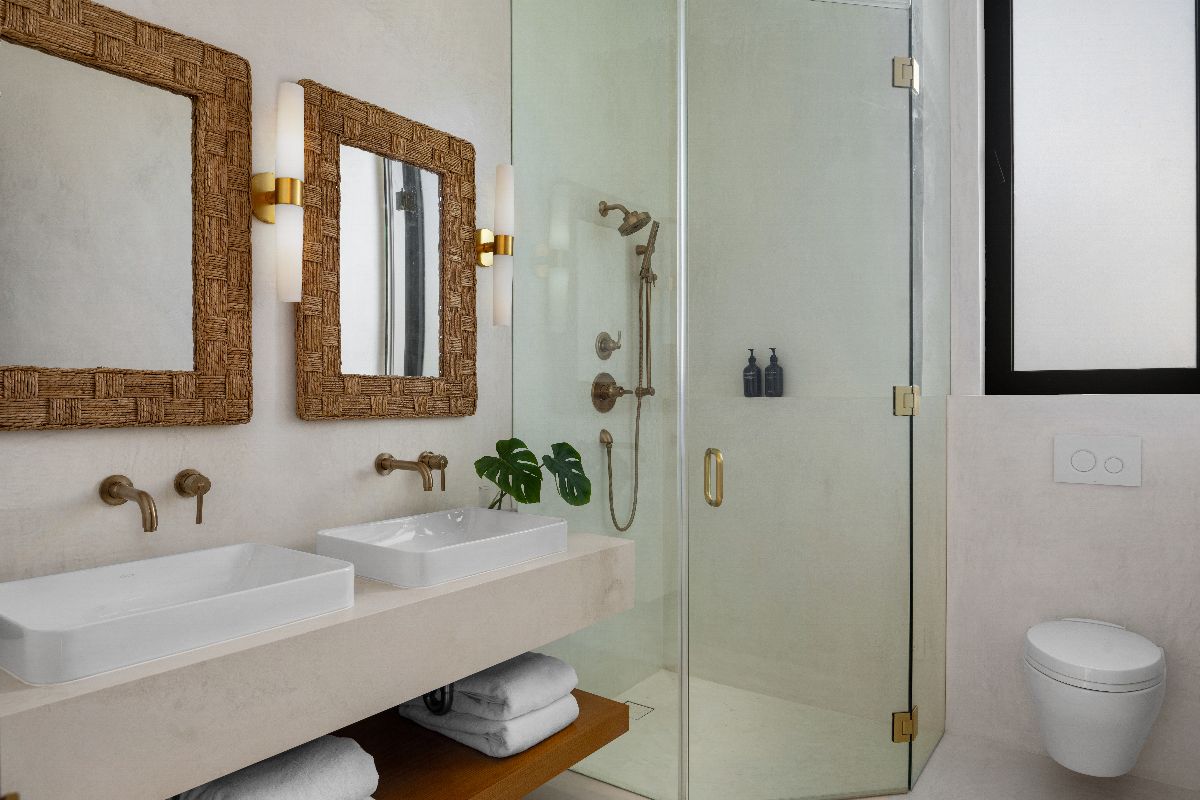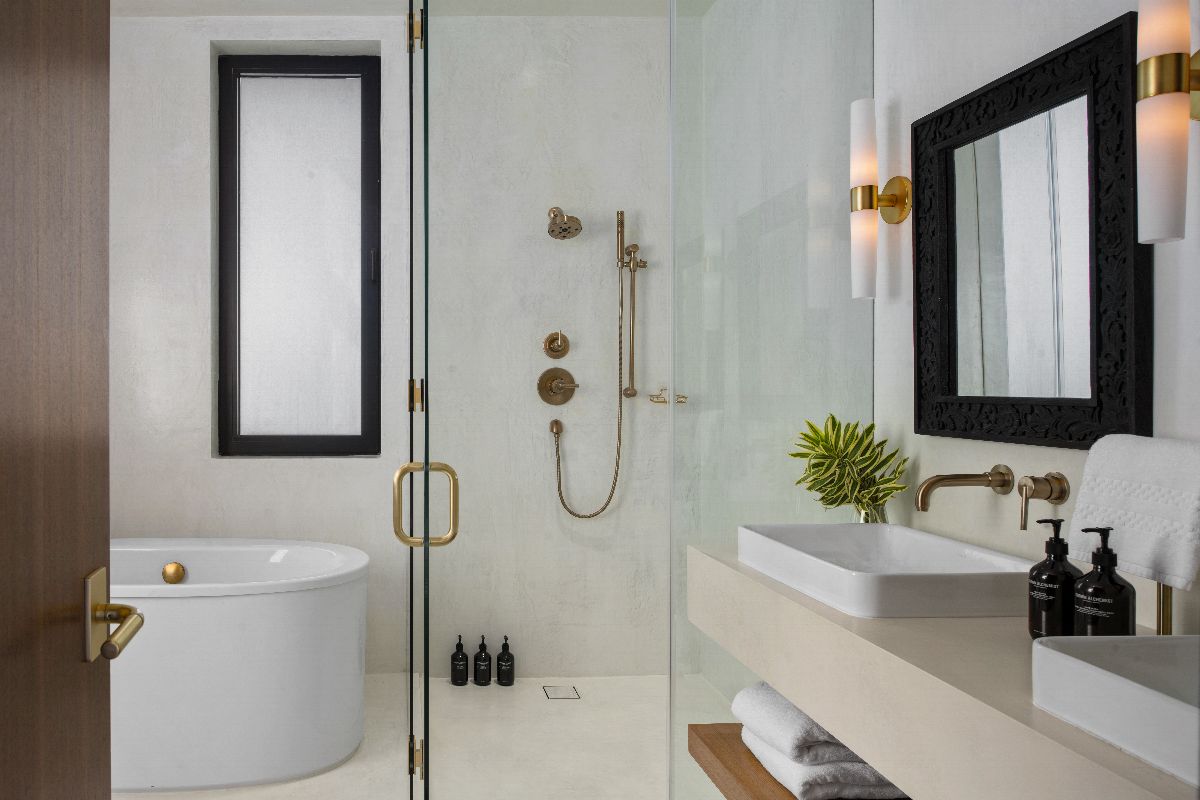 Four bedrooms open onto a shared balcony overlooking the ocean, while the principal suite offers an elevated level of luxury, complete with a spa-style bathroom featuring indoor and outdoor showers and a sculptural circular bathtub.