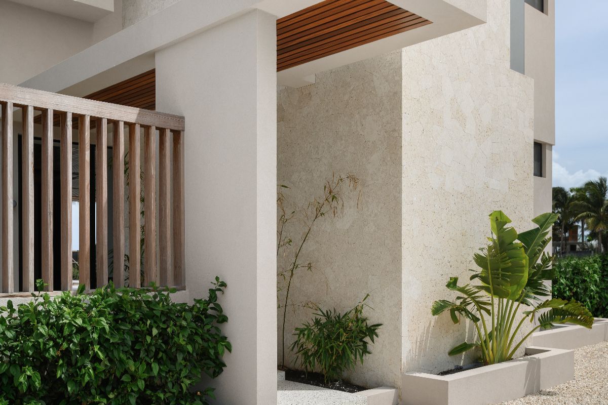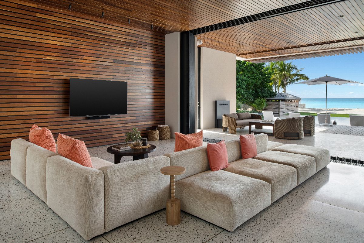 A covered terrace provides space for al fresco dining and relaxation, while the beachfront setting ensures uninterrupted views throughout the day.