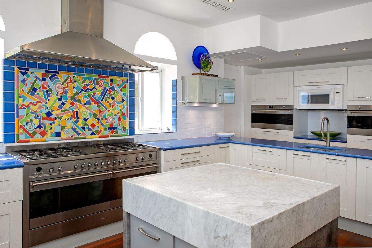 The indoor living spaces at Villa Mes Amis are designed for both relaxed living and elegant entertaining. In the main villa, casual lounge and dining areas flow naturally into a more formal dining space and a fully equipped gourmet kitchen. Sliding glass doors frame the interiors and allow natural light and sea views to remain a constant presence throughout the home.