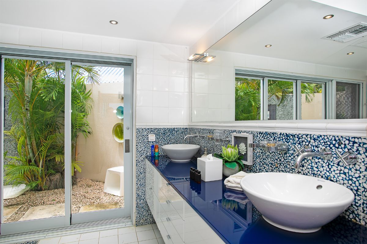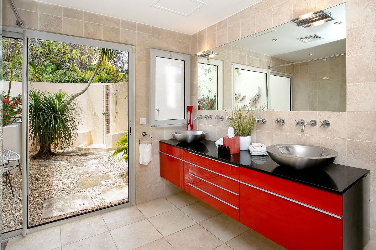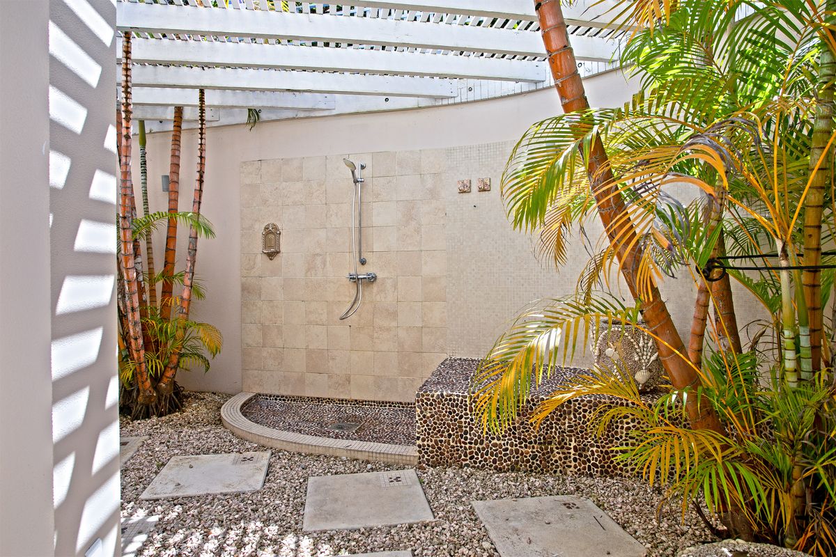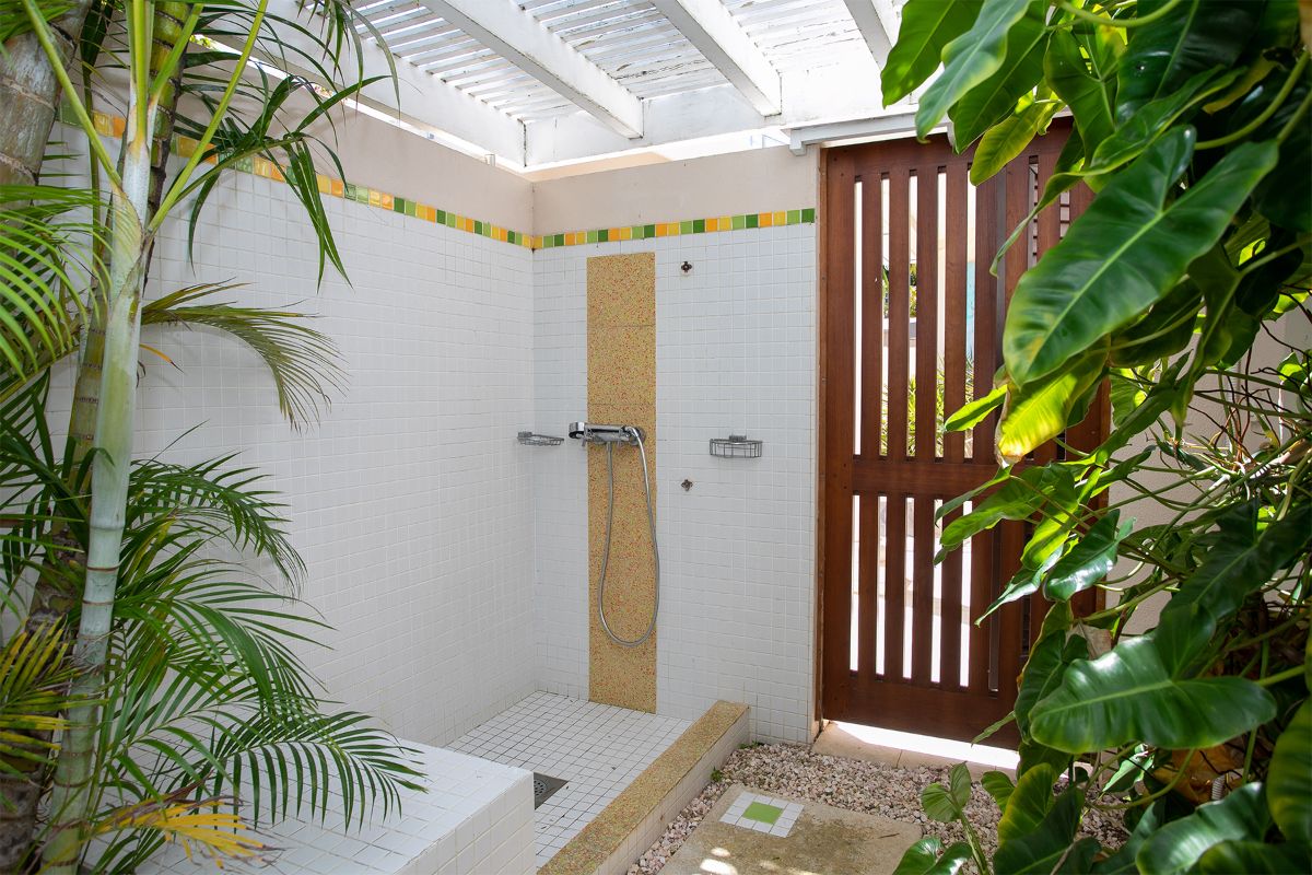 Seven bedrooms are located within the main villa. Each features an en-suite bathroom with both indoor and outdoor showers, blending modern comfort with a tropical feel. The primary suite is particularly impressive, with a private terrace that offers breathtaking views and a serene place to unwind.