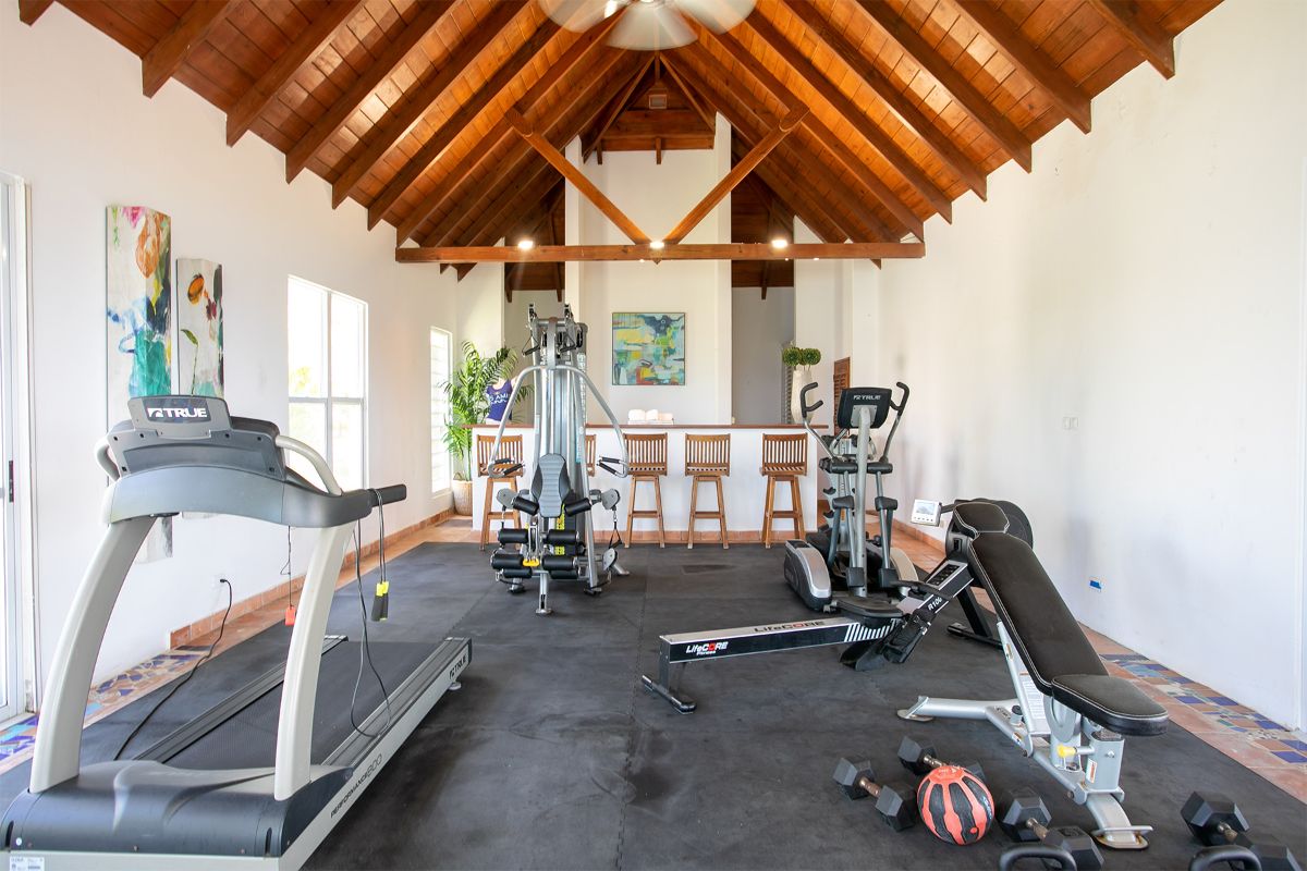 A dedicated media room provides a comfortable setting for movie nights or downtime, while a well-equipped gym allows guests to maintain their fitness routines during their stay. Across all three villas, the interiors reflect a relaxed Caribbean style with generous proportions, encouraging guests to gather comfortably or retreat into quieter spaces as desired.