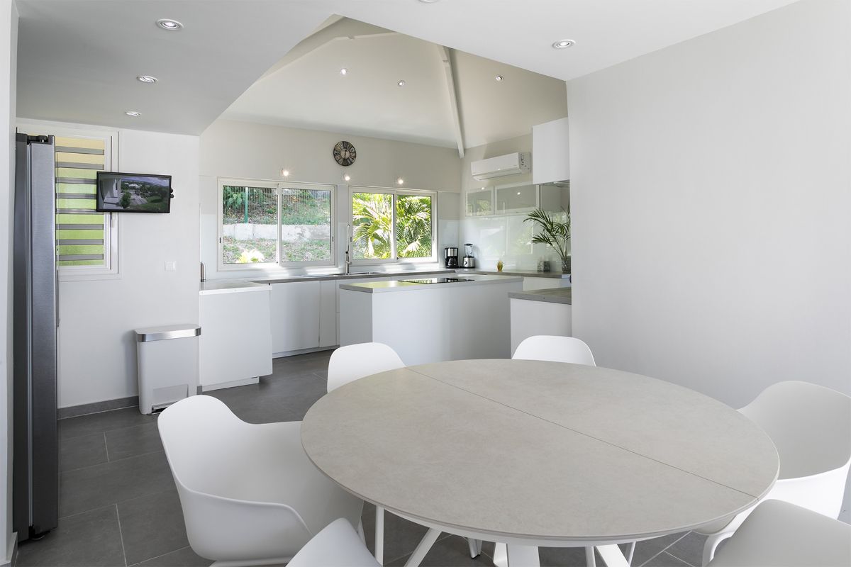 Inside, Villa Ocean View combines contemporary design with relaxed tropical elegance. The open-plan living area is bright and airy, enhanced by cool tiled floors and soft coastal tones. Comfortable lounge seating invites relaxation, while large sliding glass doors open fully to the terrace, allowing natural light and sea breezes to flow throughout.