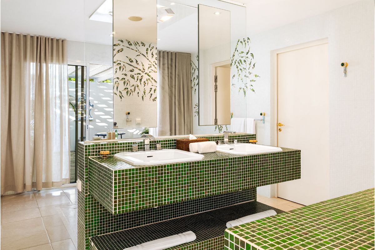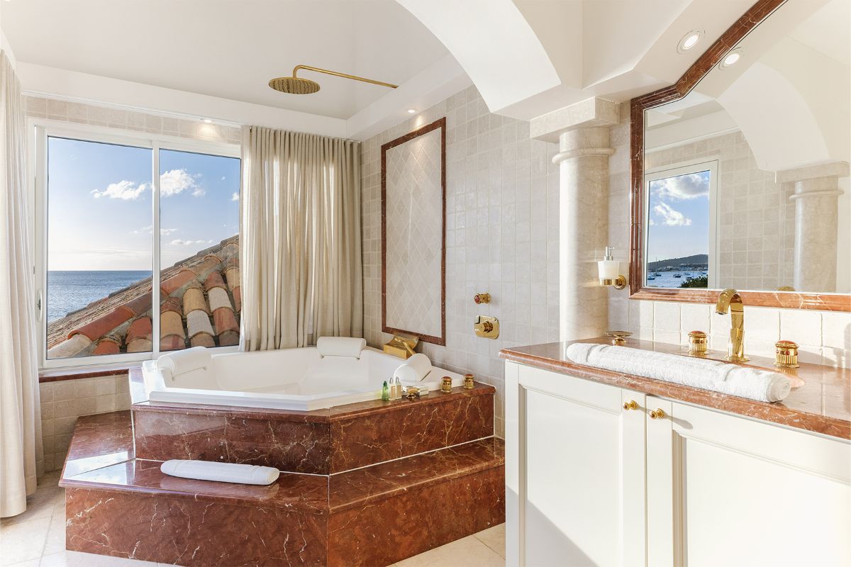 The primary suite occupies its own private sanctuary at the top of a marble staircase and includes a terrace overlooking the sea. Each en-suite bathroom is a statement in design, showcasing semi-precious stone fixtures, sculptural tubs, and overhead showers. Several bathrooms also offer ocean views and private patios, creating spa-like retreats within the villa.