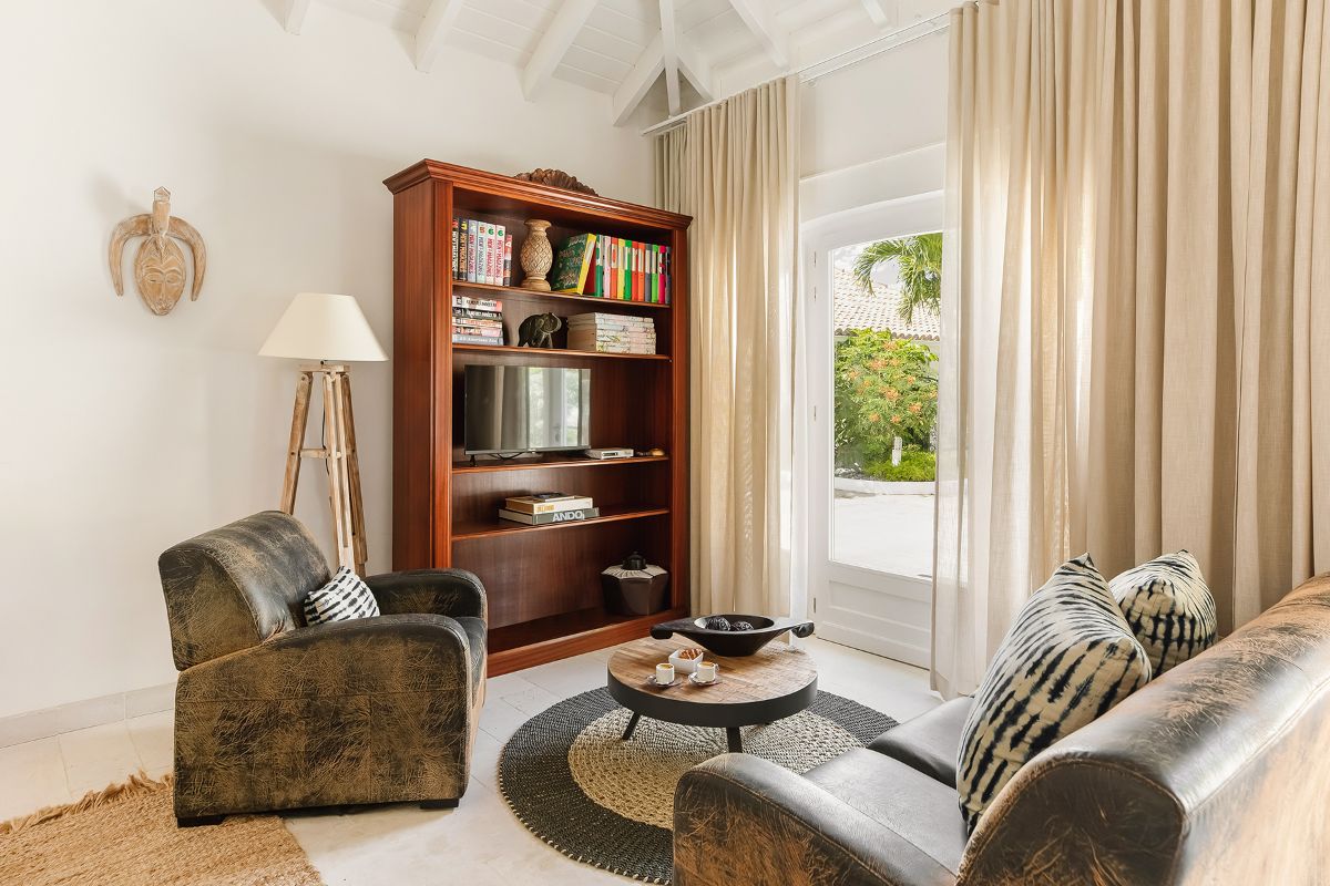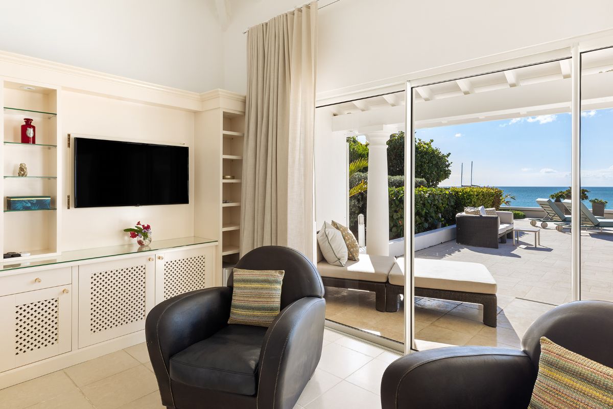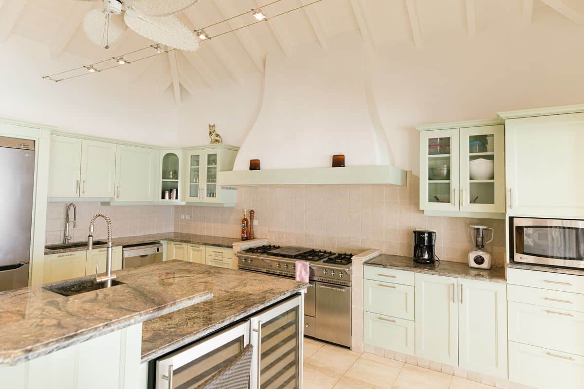 The main living area can be fully air-conditioned or opened to the ocean breeze, offering flexibility throughout the day. Adjacent to the living room is a semi-private media room and library, ideal for relaxed evenings. The French Caribbean-style kitchen, finished in soft greens and grey marble, features a professional Lacanche stove and stunning sea views. A built-in outdoor barbecue adds further versatility for alfresco dining.