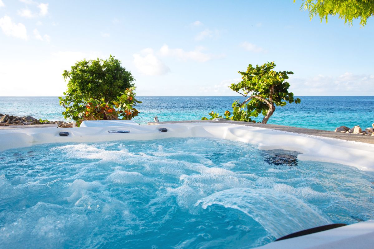 Life at Sandcastle Beach House unfolds effortlessly outdoors. The villa’s expansive terrace features a 28-foot private pool and a six-person Jacuzzi, both offering sweeping views of the turquoise Caribbean. Comfortable loungers, shaded seating areas, and an alfresco dining space with a built-in BBQ make it easy to spend entire days in the sun or under the stars.