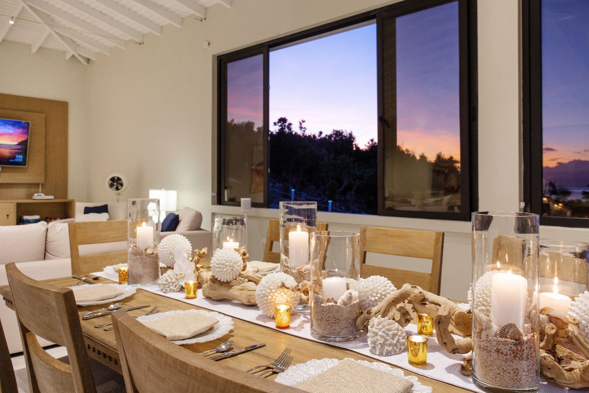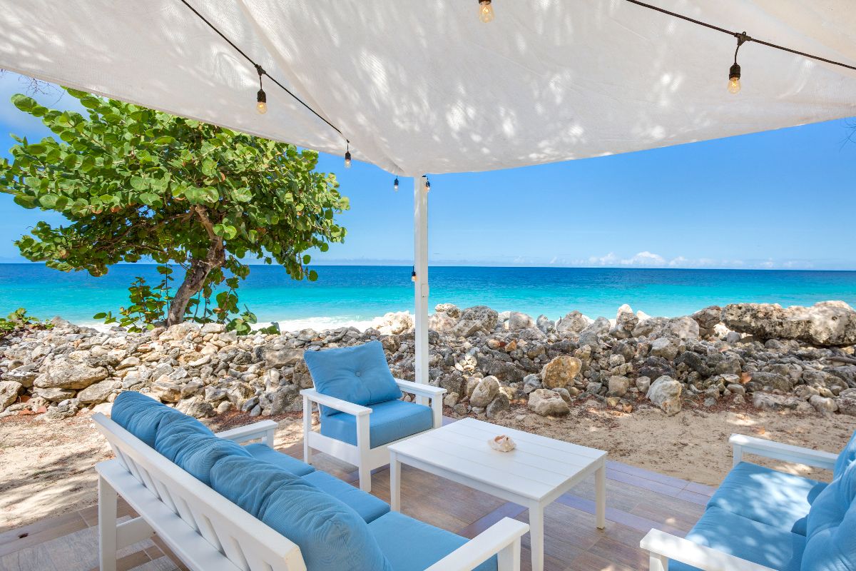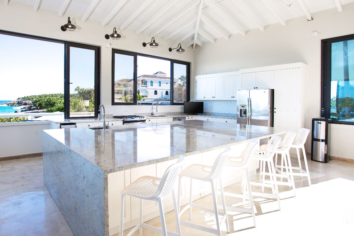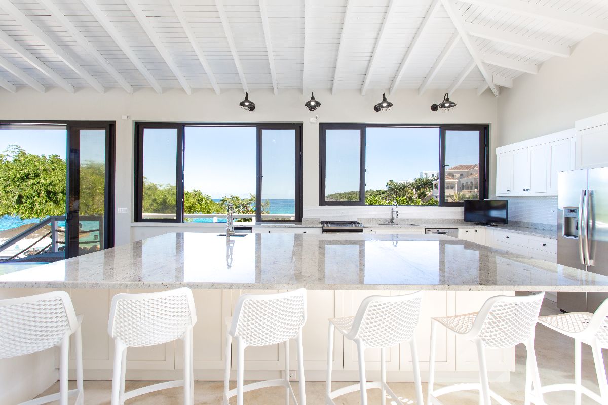 Spanning 2,400 square feet, Sandcastle Beach House combines open, airy interiors with the soothing rhythm of the sea. High ceilings, spacious living areas, and panoramic ocean views set the tone for a stay defined by tranquility and style. Whether you’re enjoying cocktails at the island bar, gathering around the ten-person dining table, or simply unwinding in the shade of the outdoor lounge, the villa invites you to slow down and embrace the relaxed pace of island life.