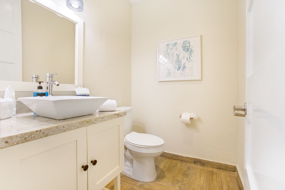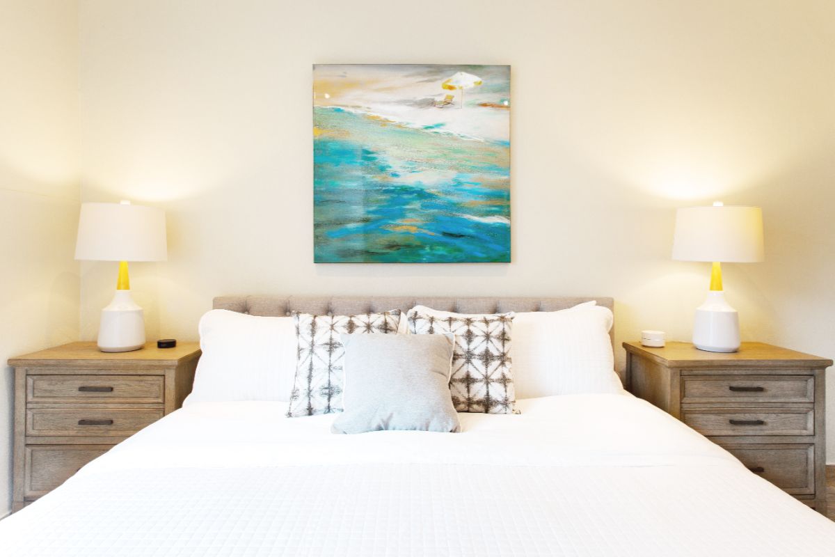 Just beyond the terrace, a private staircase leads to the villa’s beachfront oasis, where Adirondack chairs, oversized umbrellas, and loungers are set up on the sand. Swim in the calm waters, take a leisurely paddle on a kayak or paddleboard, or simply relax by the fire pit as dusk settles in. Every moment here celebrates the art of coastal living.