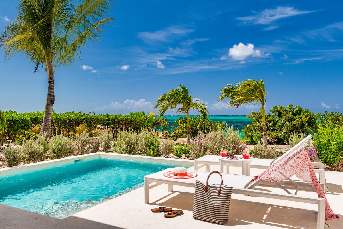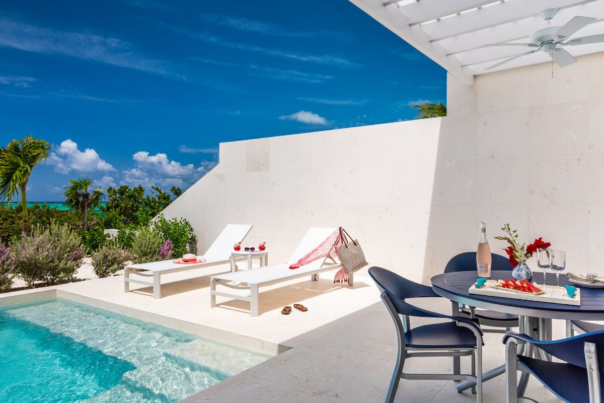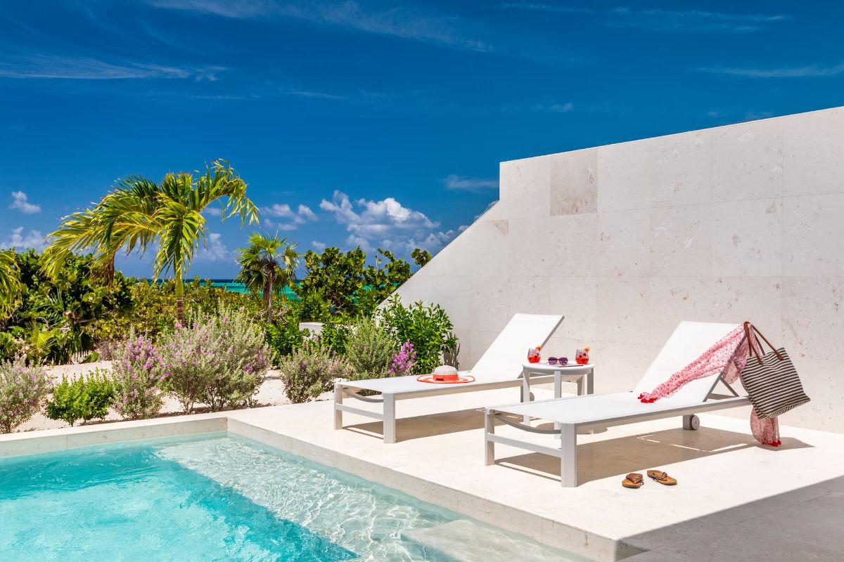 Outdoor living is central to the Sandpiper experience. A private plunge pool offers a refreshing retreat just steps from the beach, surrounded by shaded terraces and comfortable lounging areas.
