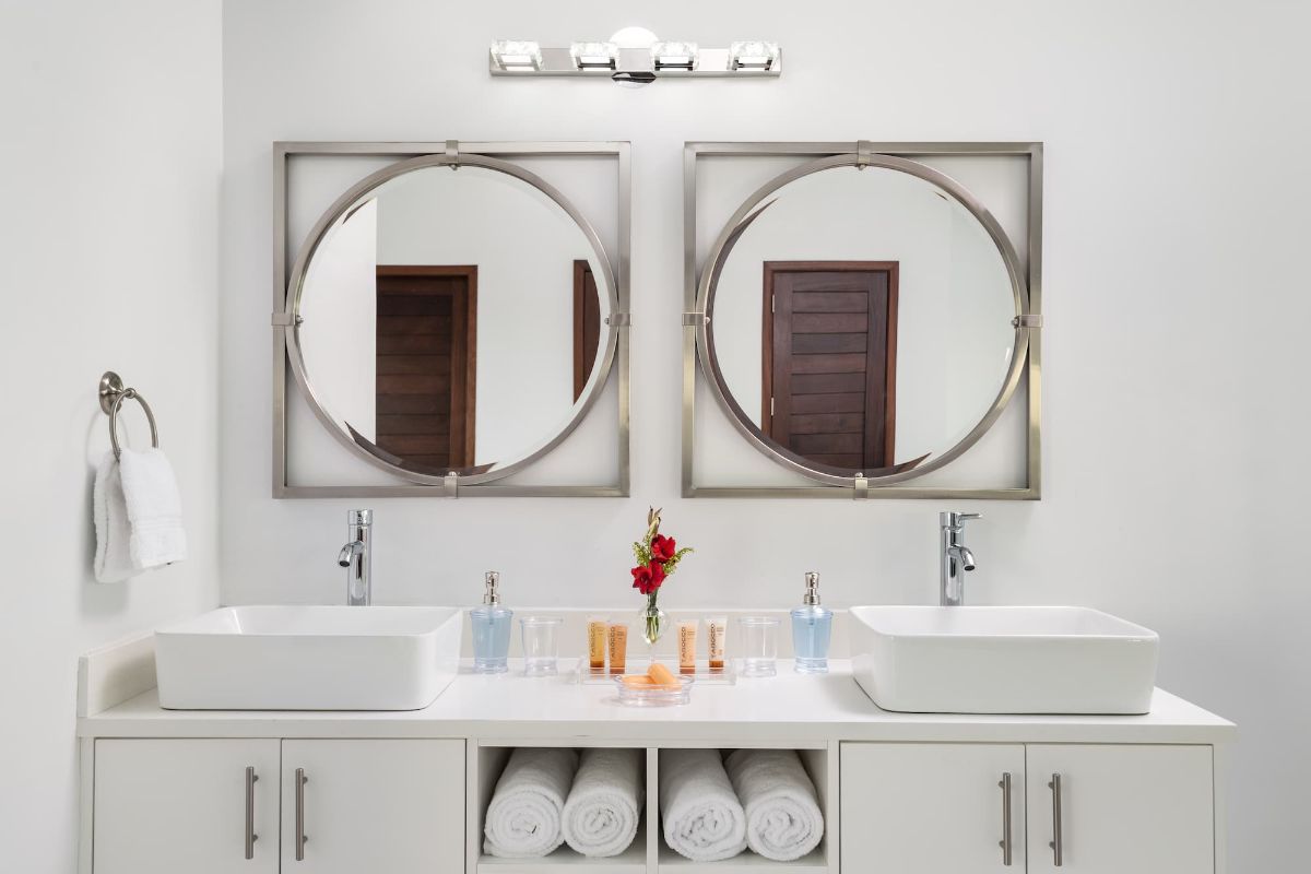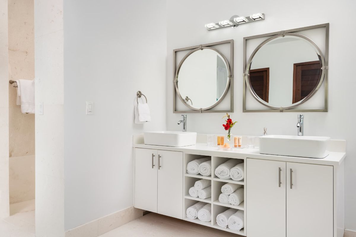 Both suites reflect the villa’s natural, contemporary aesthetic, with organic materials, soft tones, and an abundance of natural light. Freestanding bathtubs with overhead rain-fill features create a distinctive and indulgent experience, transforming everyday routines into moments of relaxation.