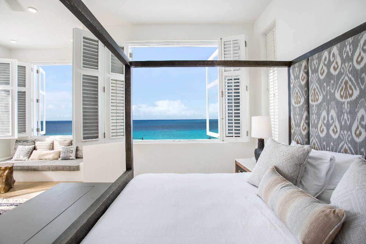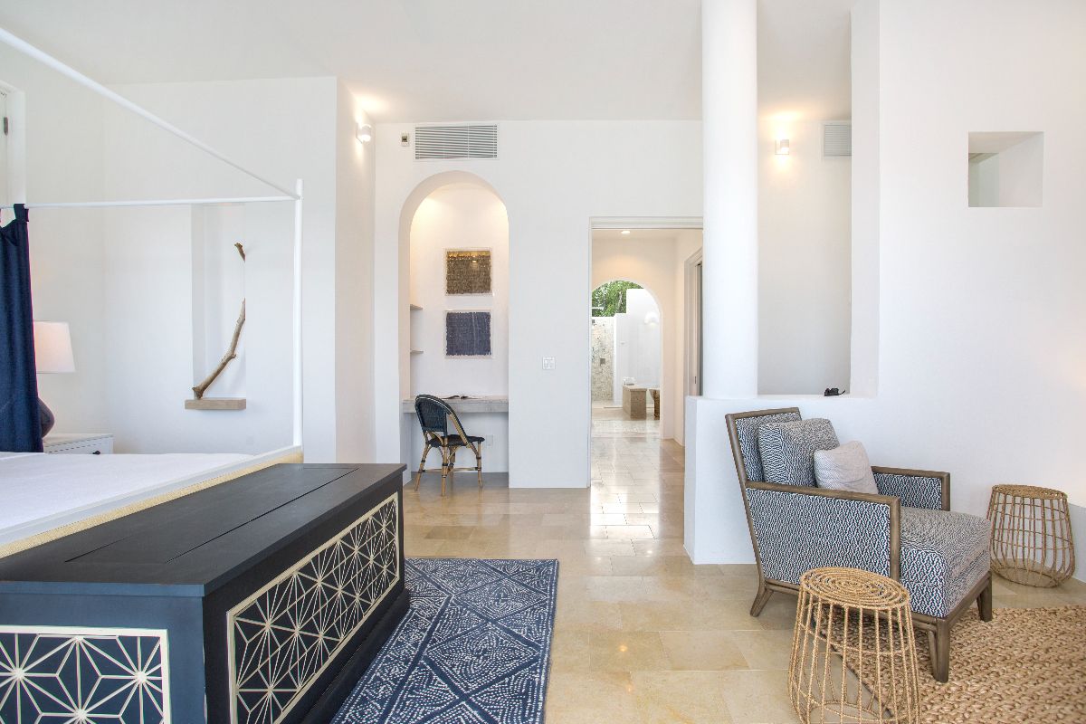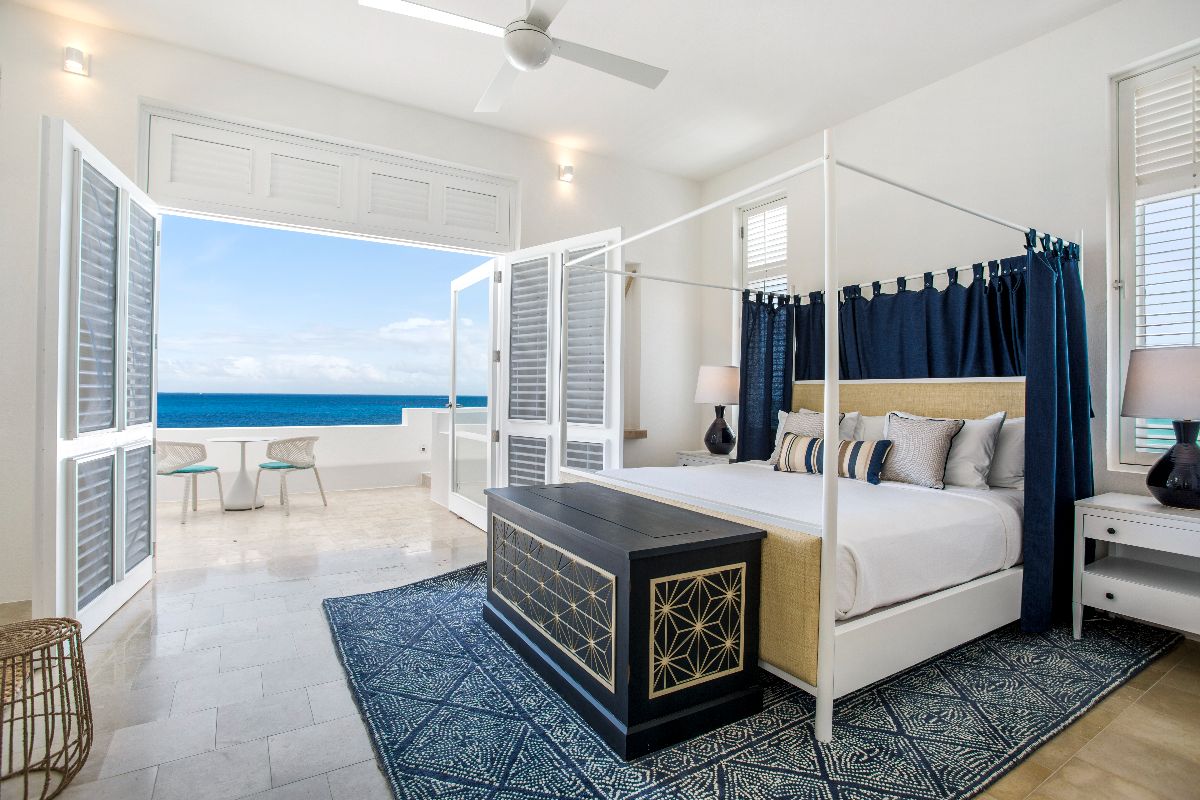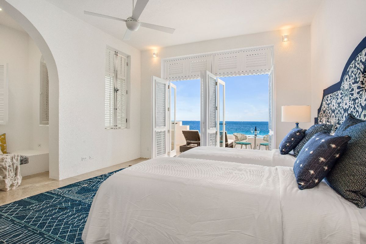 On the main floor, two primary bedrooms feature king beds (which can convert to twins if desired) and spacious en-suite bathrooms with open-air showers. These suites open directly onto private terraces, offering gentle breezes and soothing ocean sounds. Upstairs, two additional primary suites enjoy elevated sea views and equally indulgent en-suite bathrooms, each leading out to a private balcony where guests can enjoy the sunrise or evening stars.