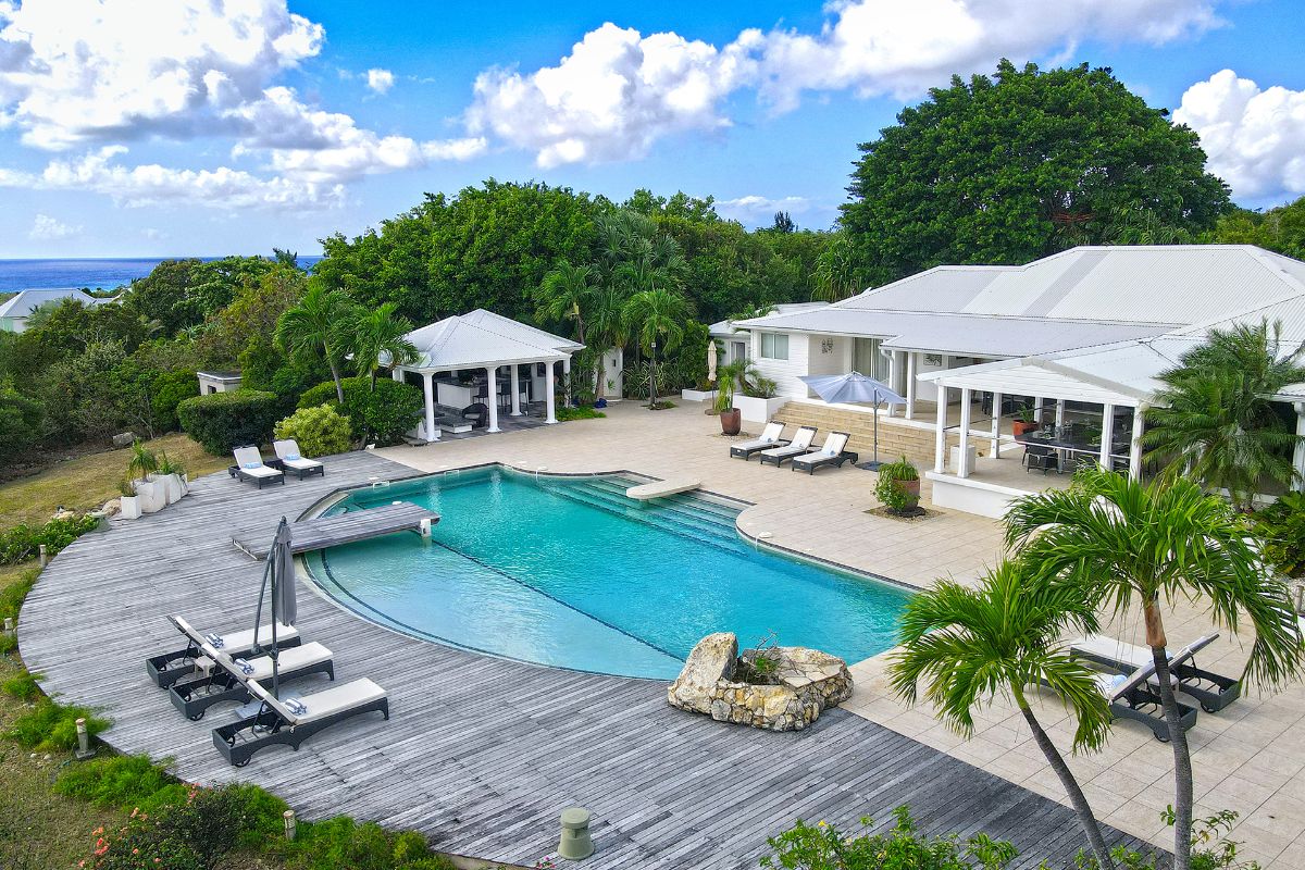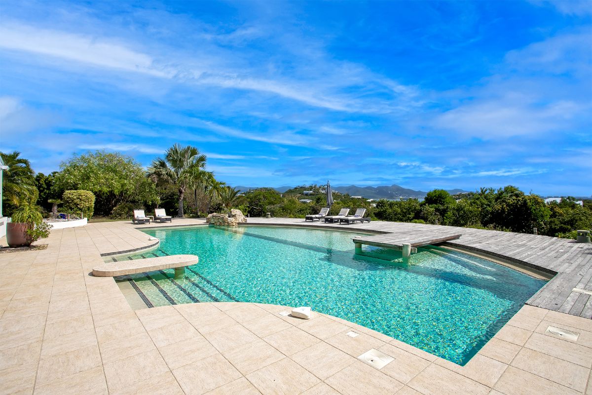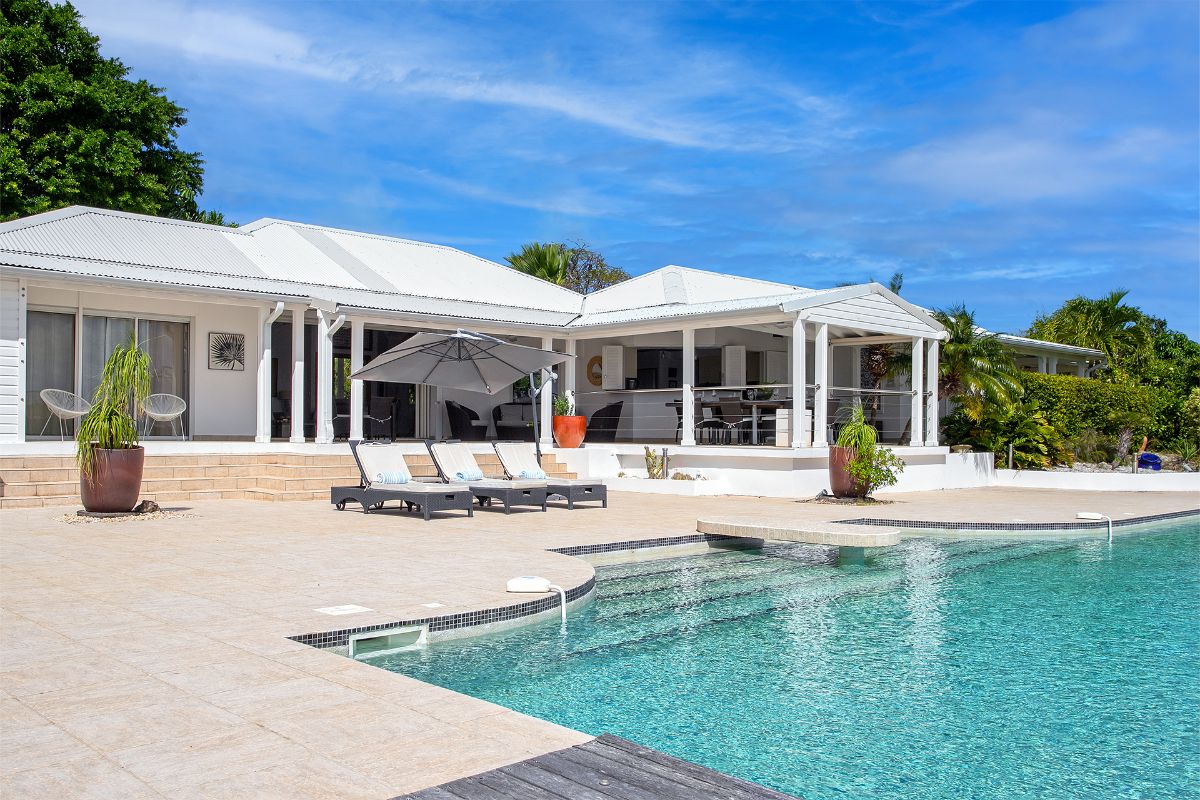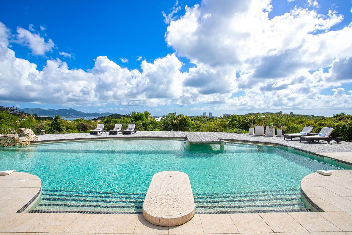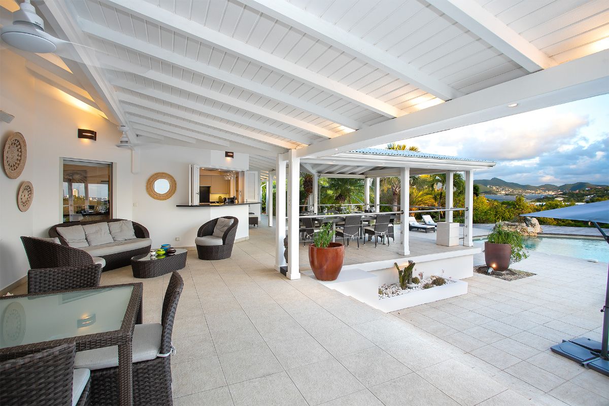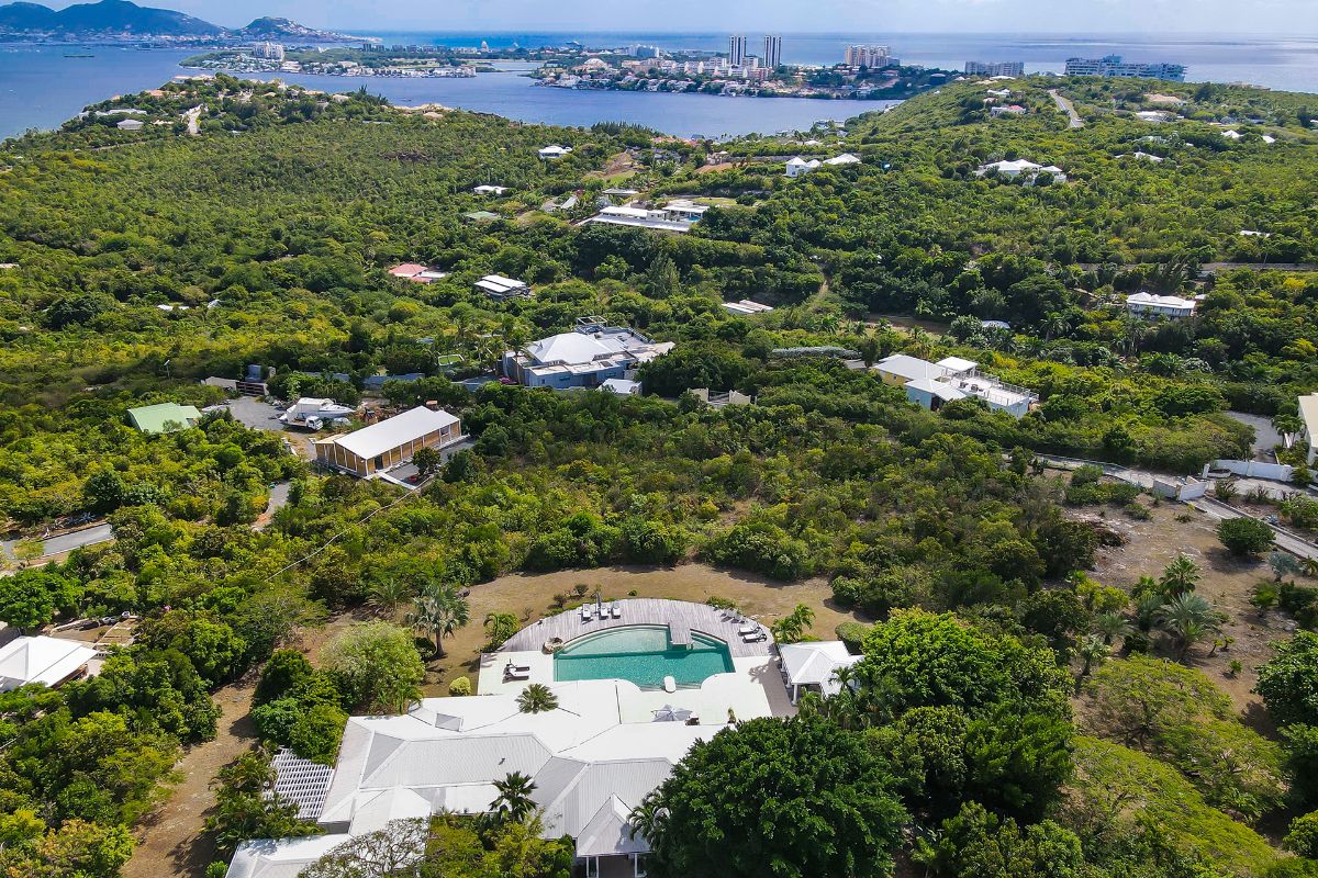 Villa Sol e Luna is a refined Caribbean retreat that beautifully blends French Creole charm with contemporary sophistication. Set behind a private gated entrance, a palm-lined driveway winds through lush tropical gardens before revealing a breathtaking panorama of emerald hills cascading toward Simpson Bay Lagoon and the sparkling Caribbean Sea.