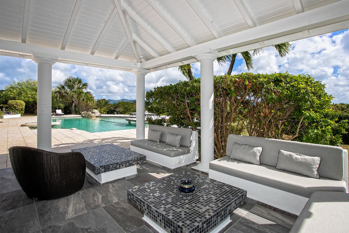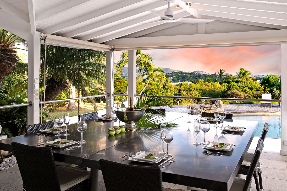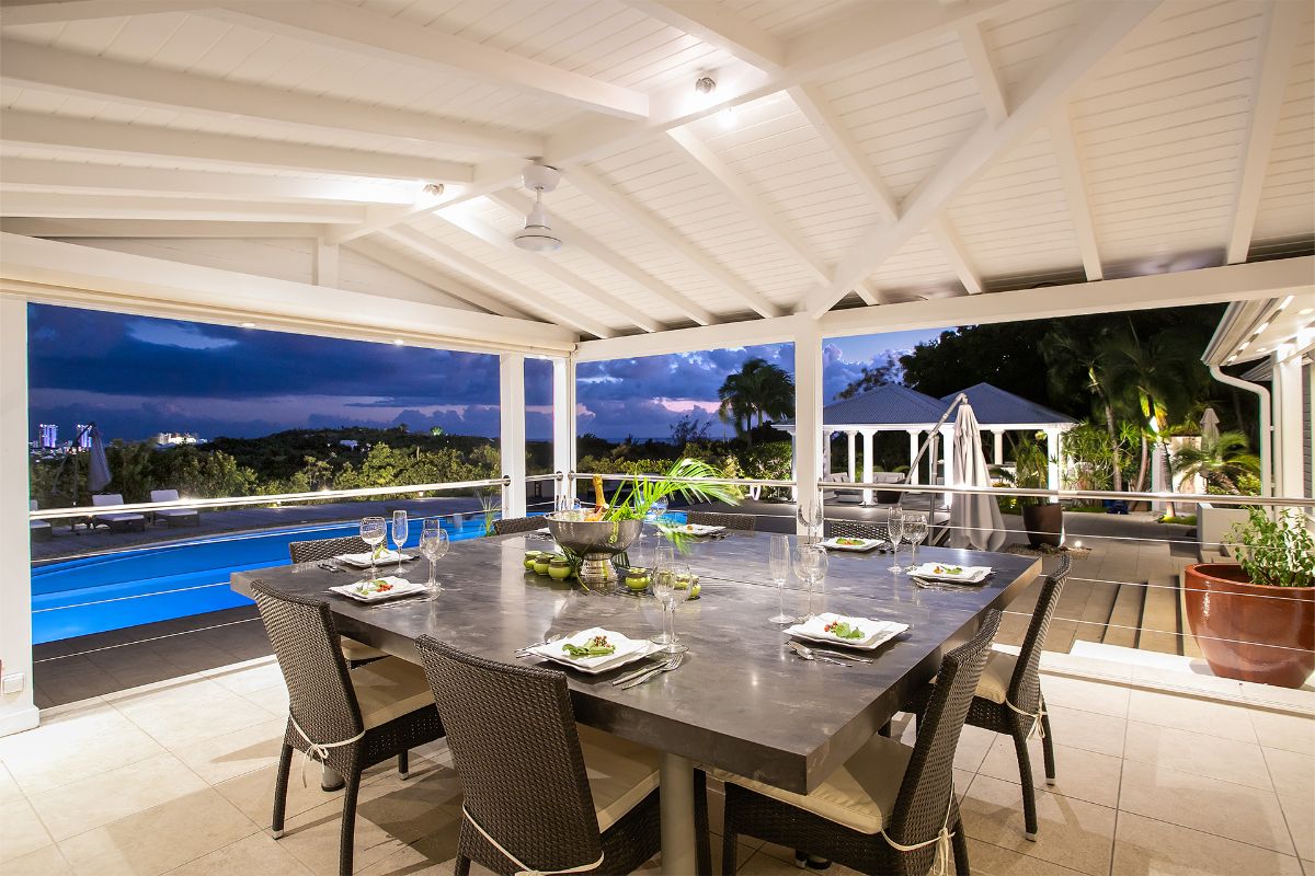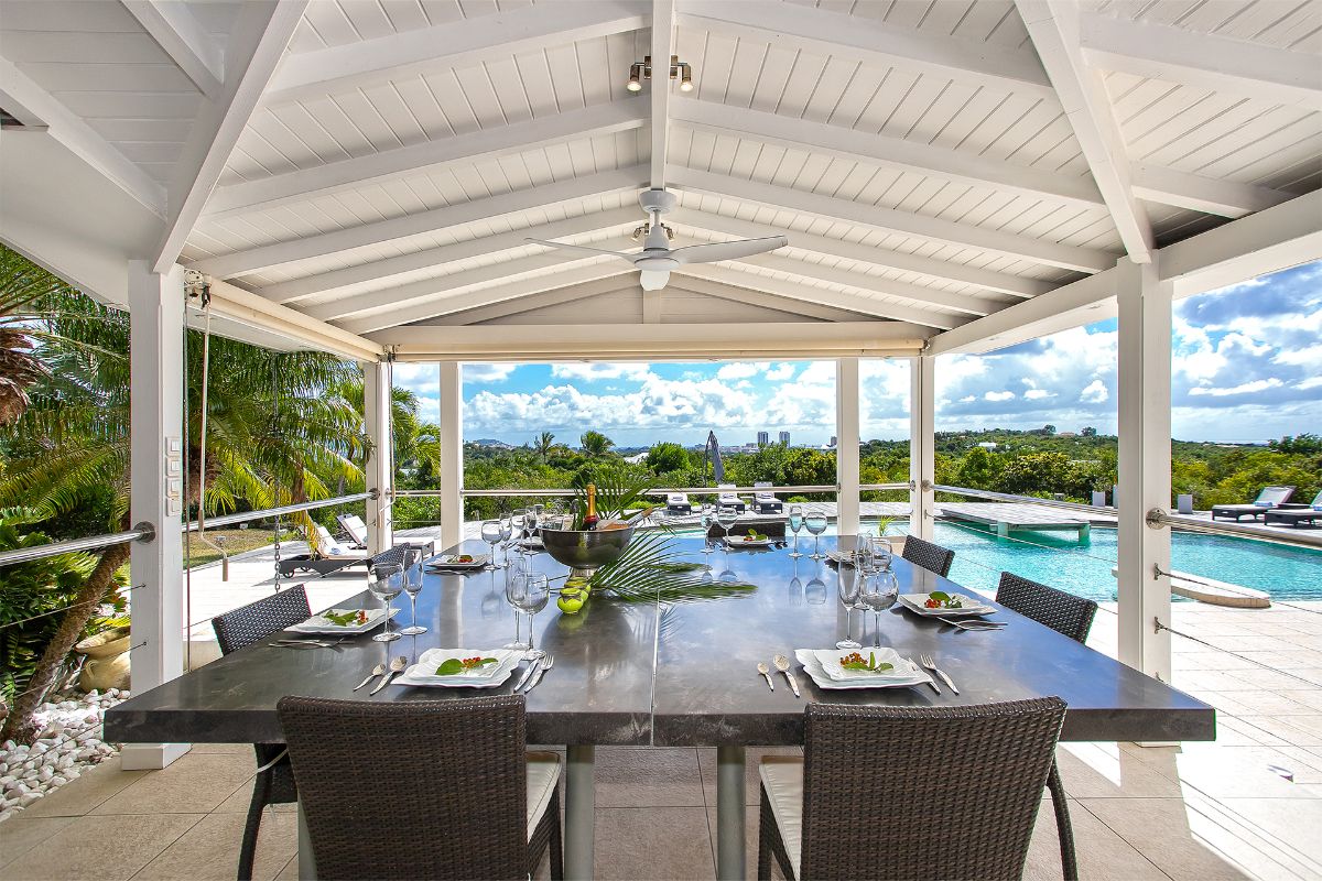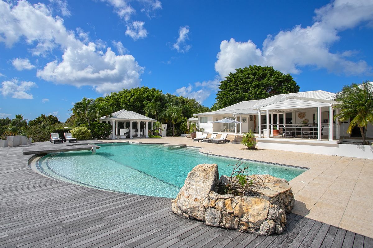 Villa Sol e Luna is a refined Caribbean retreat that beautifully blends French Creole charm with contemporary sophistication. Set behind a private gated entrance, a palm-lined driveway winds through lush tropical gardens before revealing a breathtaking panorama of emerald hills cascading toward Simpson Bay Lagoon and the sparkling Caribbean Sea.