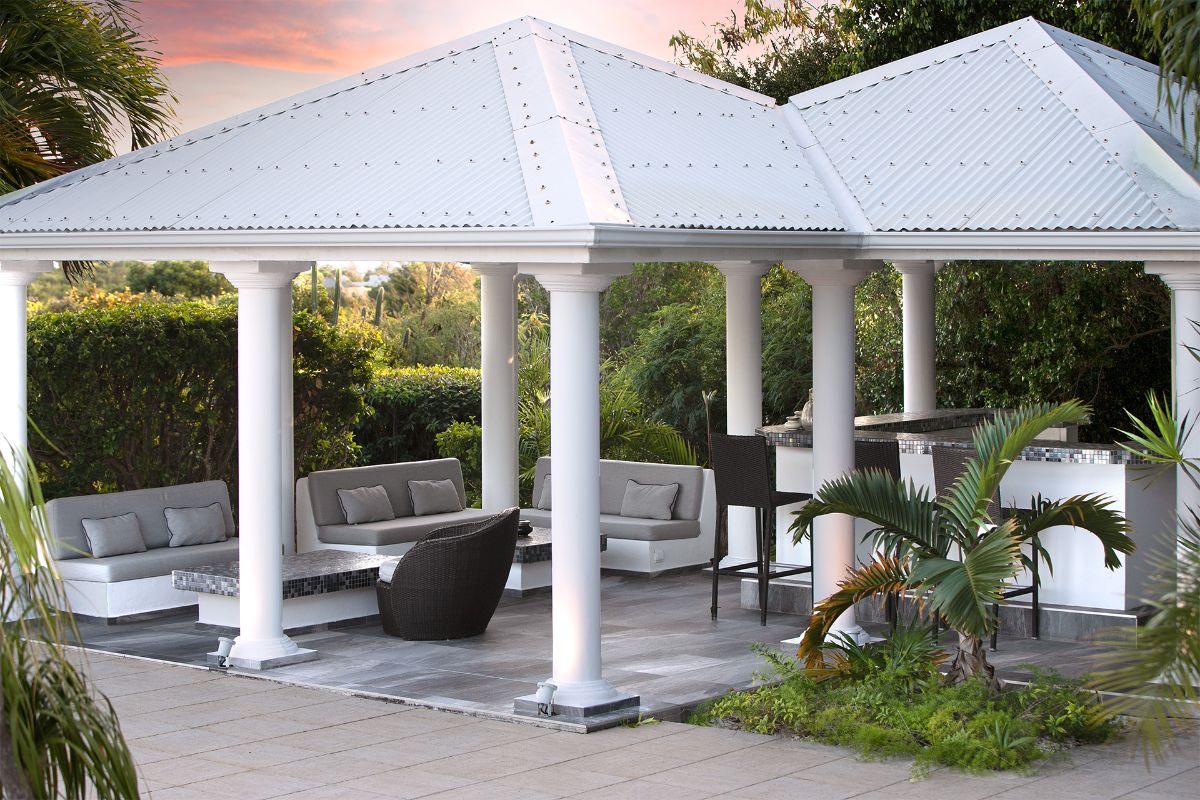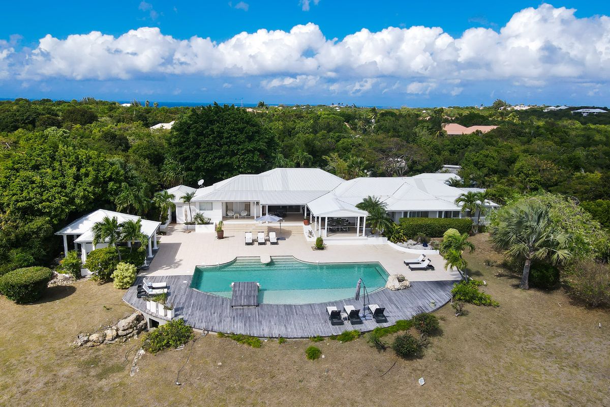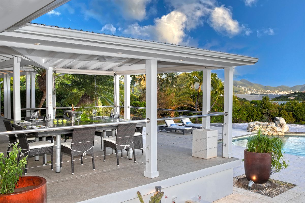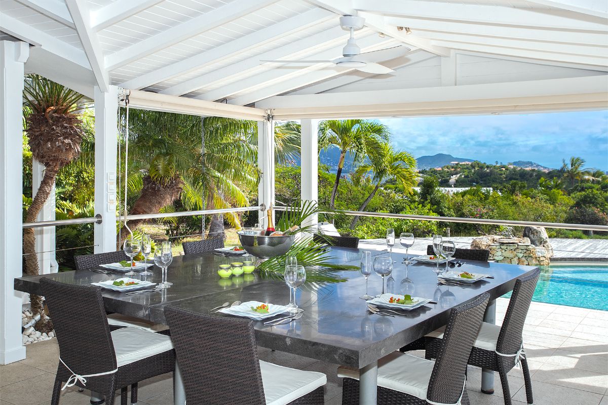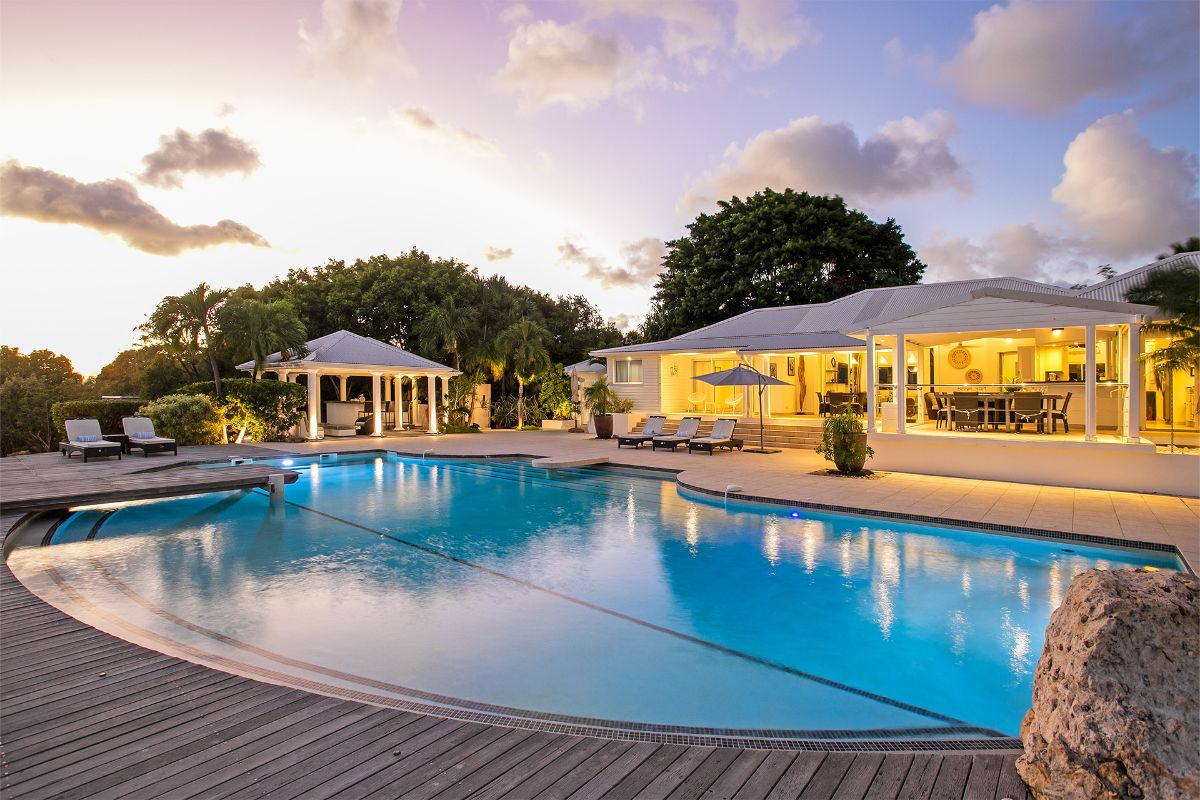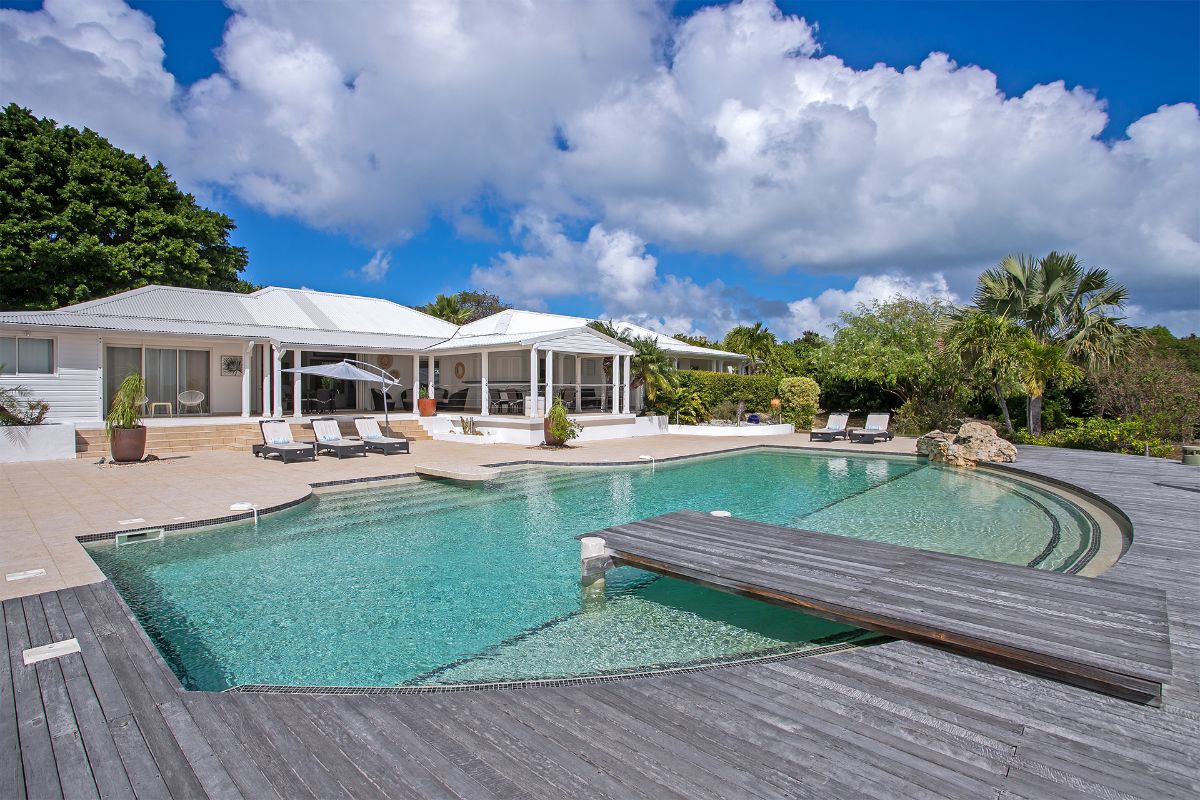 Villa Sol e Luna is a refined Caribbean retreat that beautifully blends French Creole charm with contemporary sophistication. Set behind a private gated entrance, a palm-lined driveway winds through lush tropical gardens before revealing a breathtaking panorama of emerald hills cascading toward Simpson Bay Lagoon and the sparkling Caribbean Sea.
