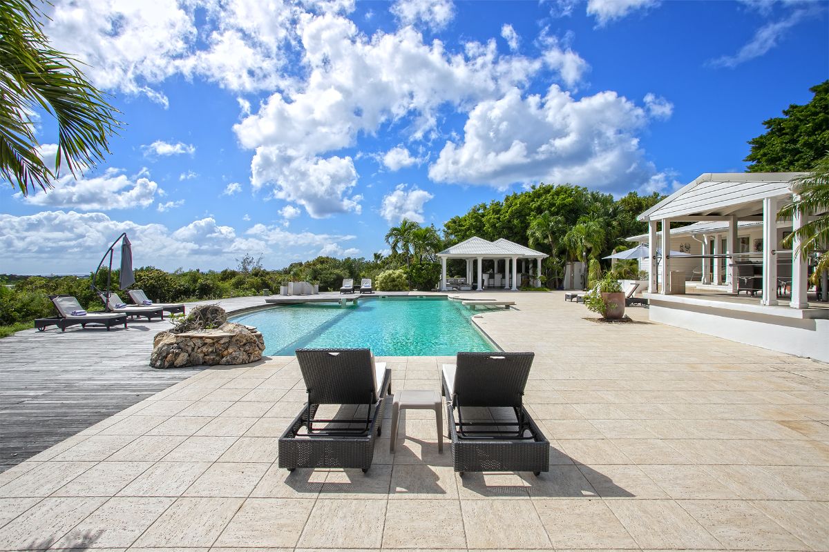 Inside, the open-plan great room flows seamlessly onto the terrace through fully retractable glass doors, blurring the line between interior and exterior living. Clean architectural lines, neutral tones, and dark wood finishes are enhanced by subtle Caribbean accents, creating an ambience that feels both elegant and welcoming.