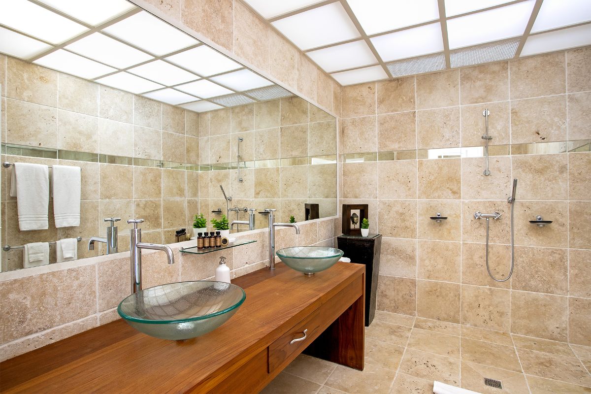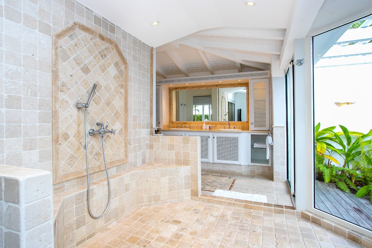 All bedrooms include spa-style en suite bathrooms with walk-in showers finished in tumbled marble and river stone. One suite features a romantic Moroccan-inspired outdoor shower, while another enjoys a private sea view from its bathroom, adding an extra touch of luxury and intimacy.